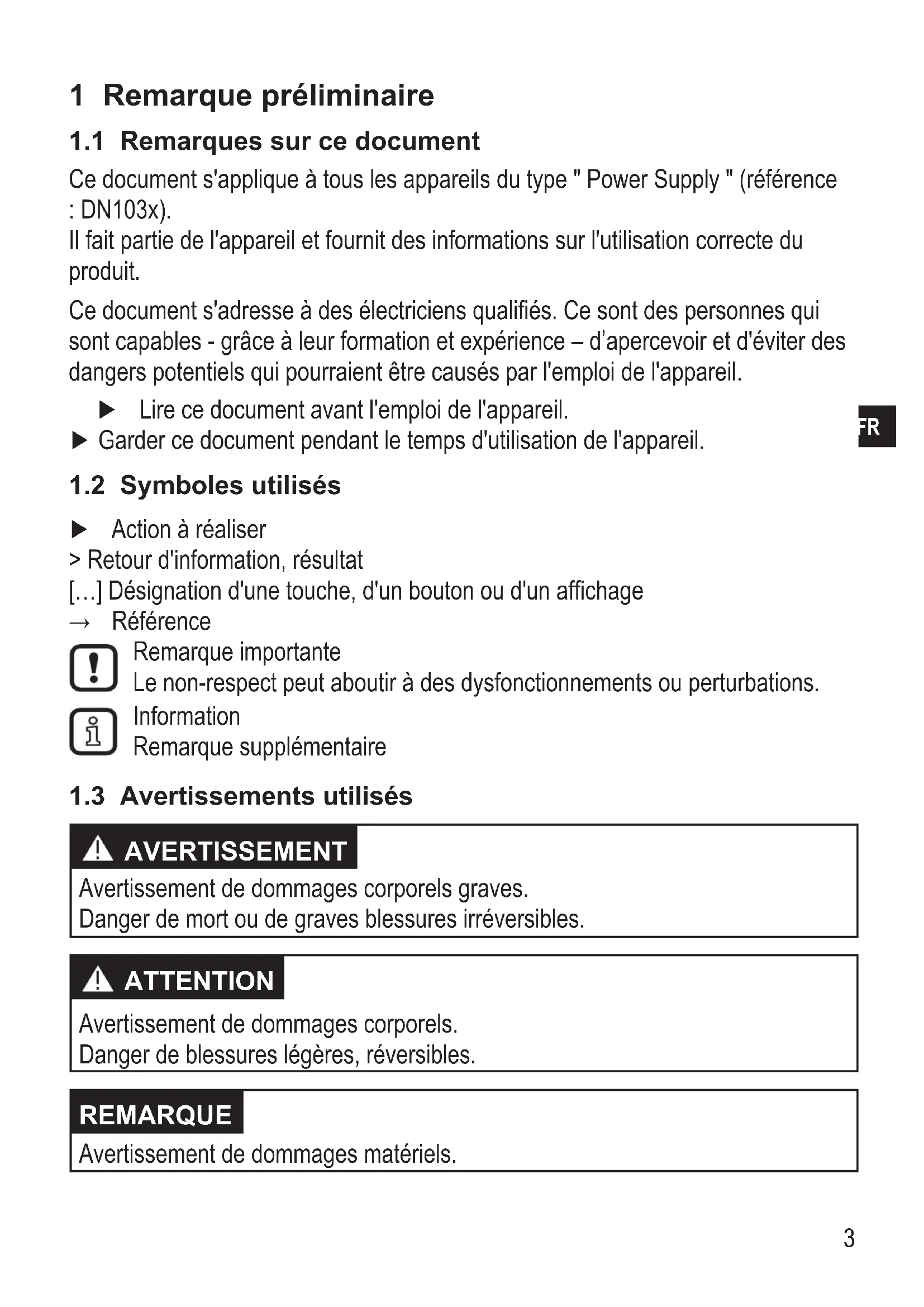 Ce document s'applique à tous les appareils du type " Power Supply " (référence : DN103x) Il fait partie de l'appareil et fournit des informations sur l'utilisation correcte du produit Ce document s'adresse à des électriciens qualifiés Ce sont des personnes qui sont capables - grâce à leur formation et expérience – d’apercevoir et d'éviter des dangers potentiels qui pourraient être causés par l'emploi de l'appareil ► Lire ce document avant l'emploi de l'appareil ► Garder ce document pendant le temps d'utilisation de l'appareil