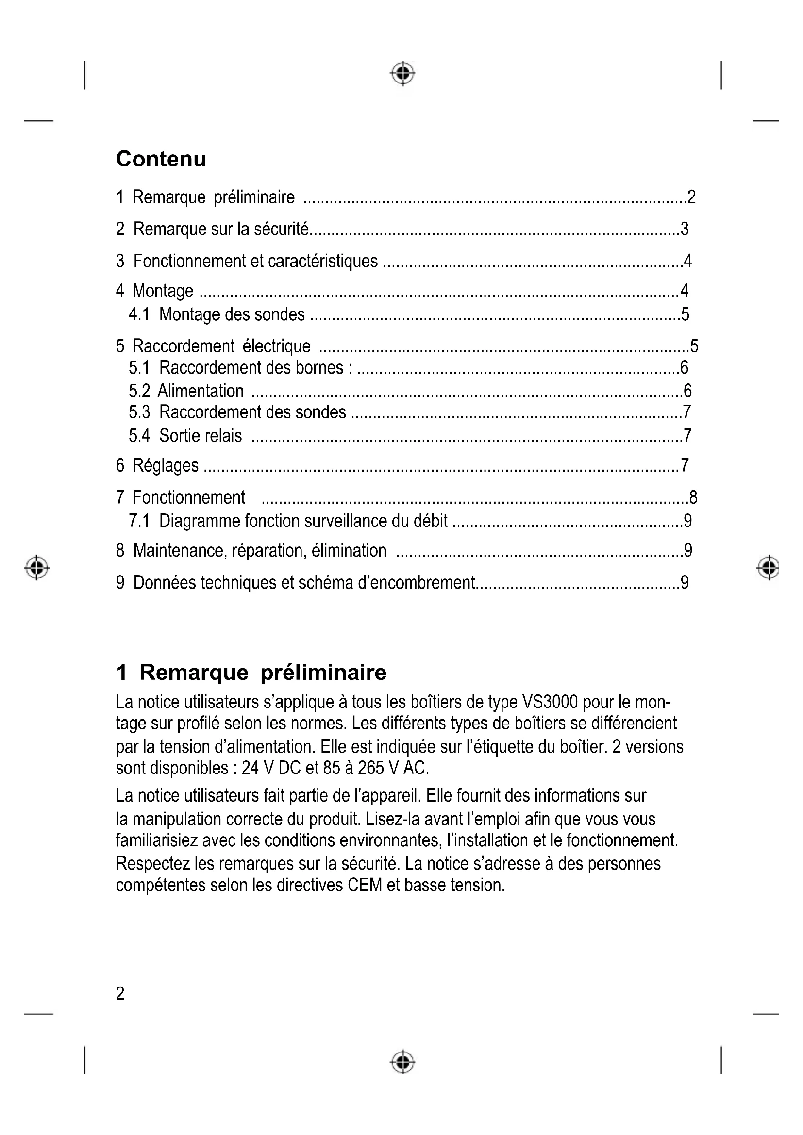 - En cas de mauvais fonctionnement de l’appareil ou en cas de doute prenez contact avec le fabricant. Des interventions sur l’appareil peuvent avoir des conséquences graves pour la sécurité des personnes et des installations. Elles ne sont pas permises et aboutissent à une exclusion de responsabilité et de garantie.4 3 Fonctionnement et caractéristiques Le VS3000 est prévu pour le raccordement des sondes de débit SFxxxx. Il évalue les signaux des sondes et indique si une valeur de débit présélectionnée est atteinte ou non.