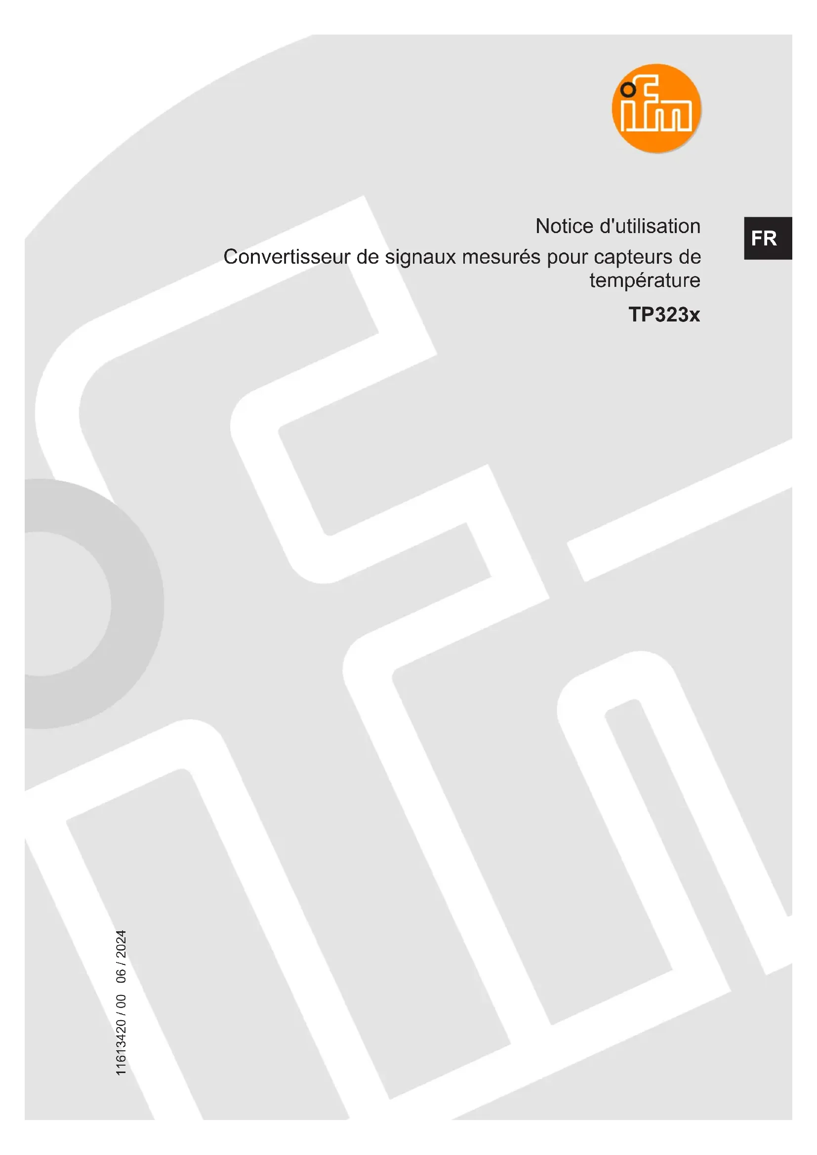 1 Remarques préliminaires Notice d’utilisation, données techniques, homologations et informations supplémentaires via le code QR sur l’appareil / l’emballage ou sur documentation.ifm.com. 1.1 Symboles utilisés Condition préalable Action à effectuer Réaction, résultat [...] Désignation d'une touche, d'un bouton ou d'un affichage Référence Remarque importante Le non-respect peut aboutir à des dysfonctionnements ou perturbations Information Remarque supplémentaireTP323x Convertisseur de signaux mesurés pour capteurs de température