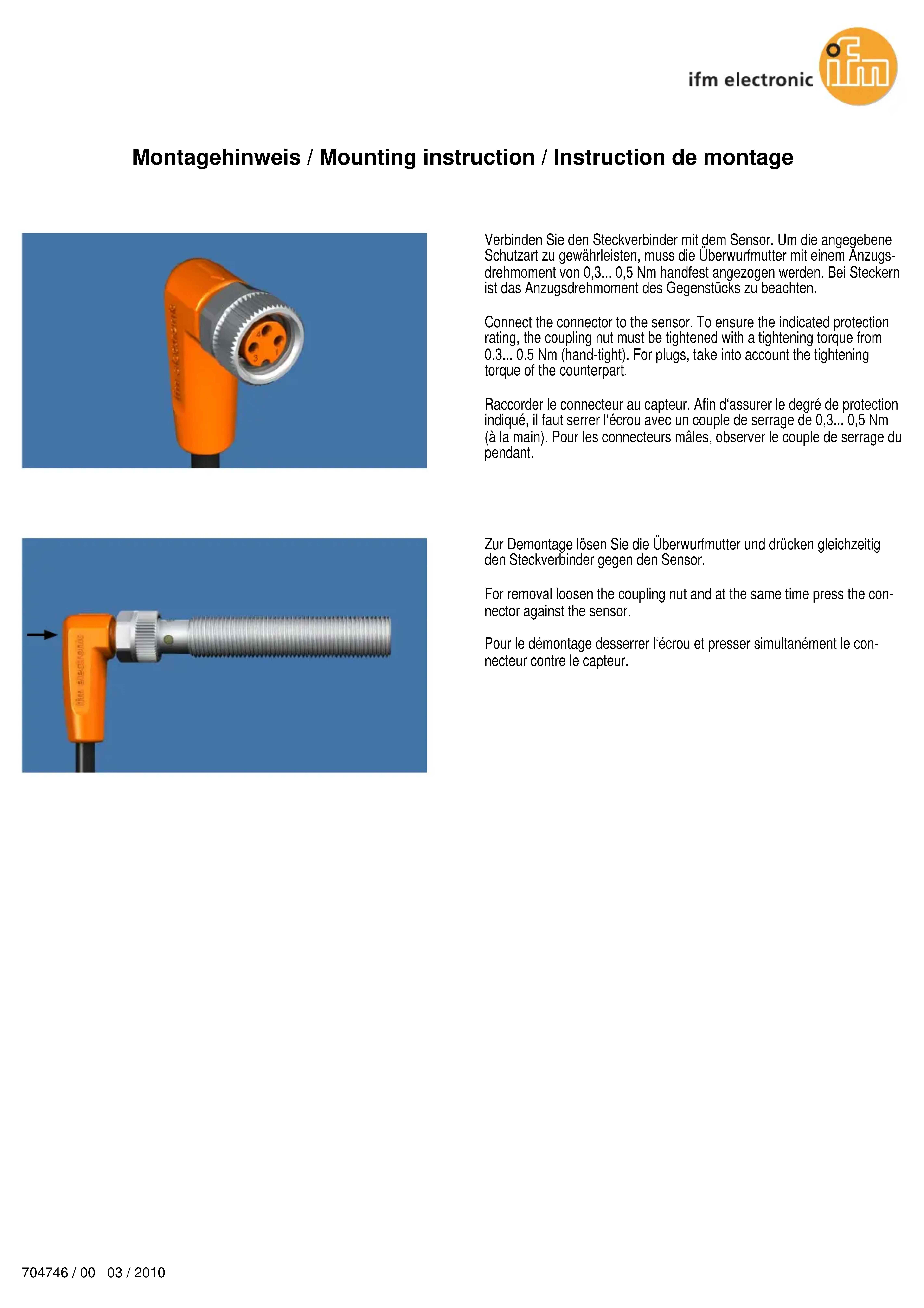 torque of the counterpart. Raccorder le connecteur au capteur. Afin d‘assurer le degré de protection indiqué, il faut serrer l‘écrou avec un couple de serrage de 0,3... 0,5 Nm (à la main). Pour les connecteurs mâles, observer le couple de serrage du pendant. Zur Demontage lösen Sie die Überwurfmutter und drücken gleichzeitig den Steckverbinder gegen den Sensor. For removal loosen the coupling nut and at the same time press the con- nector against the sensor. Pour le démontage desserrer l‘écrou et presser simultanément le con- necteur contre le capteur.
