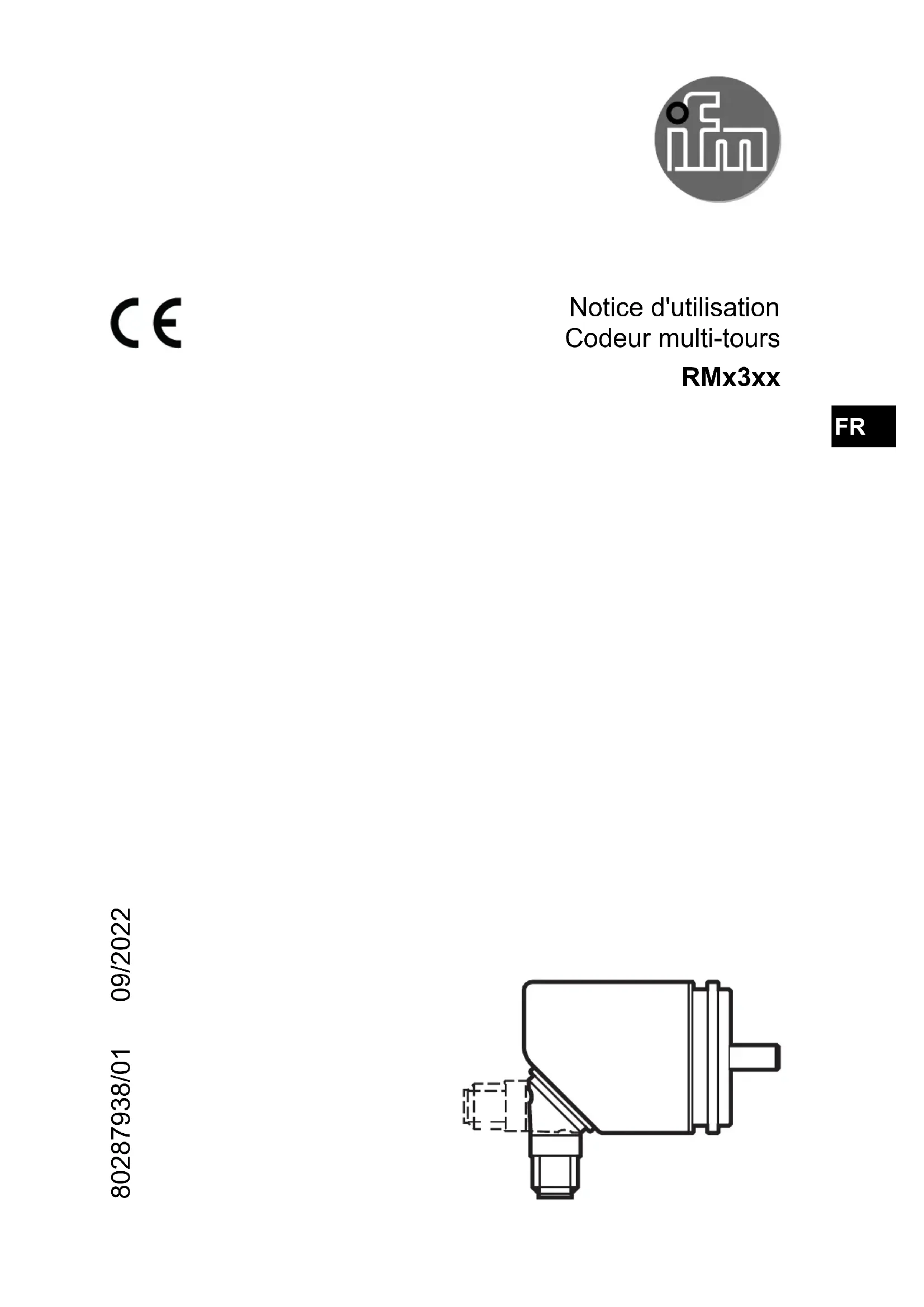 Notice d'utilisation Codeur multi-tours RMx3xx 80287938/01 09/2022 FR2 Contenu 1 Remarques préliminaires 4 11 Explication des symboles 4 2 Consignes de sécurité 4 3 Fonctionnement et caractéristiques 5 4 Montage 5 41 Schémas de montage 6 411 Boîtier avec bride synchro 6 412 Boîtier avec bride de fixation 6 413 Boîtier avec arbre creux 7 5 Raccordement électrique 8 6 Fonctions 9 61 IO-Link 9 62 Fonction de commutation vitesse de rotation 10 621 Graphiques 11 7 Paramétrage 12 71 Paramètres 13 72 Exemples d'applications 14 721 Calcul de la résolution 14 8 Eléments de service et d'indication 15 9 Maintenance, réparation et élimination 15 10 Réglage usine 153 FR4 1 Remarques préliminaires Données techniques, homologations et informations supplémentaires via le code QR sur l'appareil / l'emballage ou sur wwwifmcom