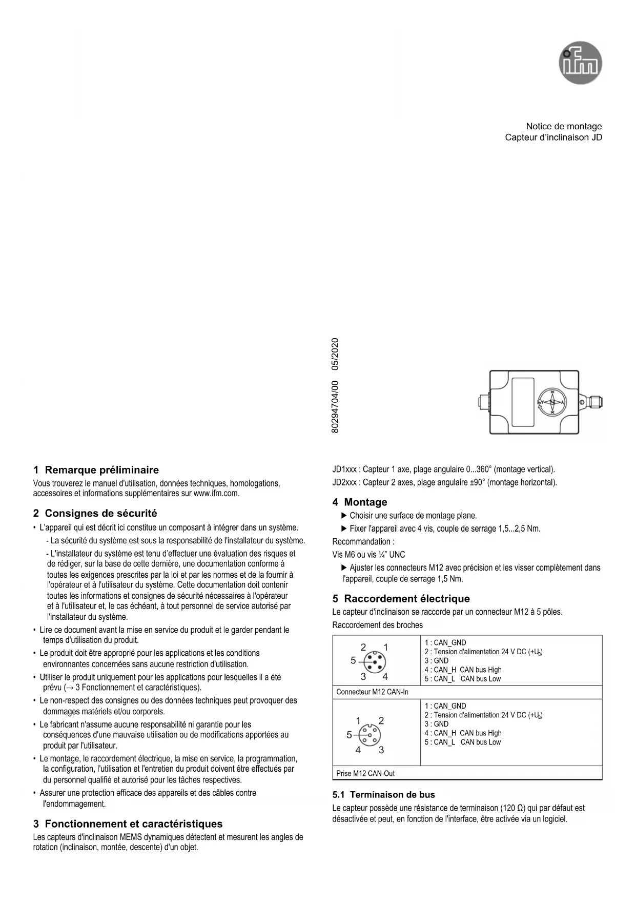 Notice de montage Capteur d’inclinaison JD 80294704/00 05/2020 1 Remarque préliminaire Vous trouverez le manuel d'utilisation, données techniques, homologations, accessoires et informations supplémentaires sur www.ifm.com. 2 Consignes de sécurité