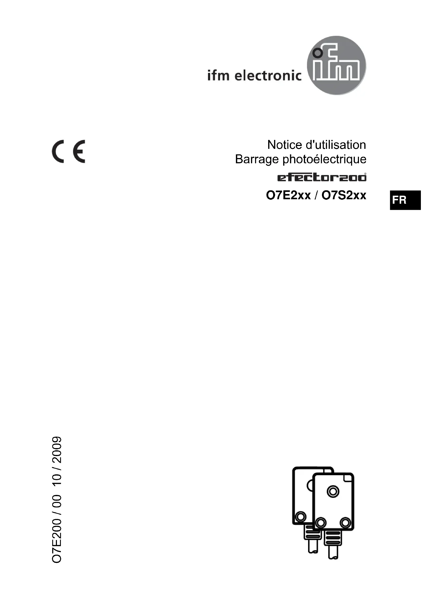 5 Fonctionnement Vérifier le bon fonctionnement de l'appareil. ► Emetteur (O7S2xx): La LED verte est allumée si l'appareil est opérationnel.• Récepteur: • Appareils avec fonction de commutation obscurcissement (O7E-DPKG) : la sortie est commutée / la LED jaune est allumée lorsqu'un objet est détecté. Appareils avec fonction de commutation éclairement (O7E-HPKG) : La sortie est commutée / la LED jaune est allumée lorsque aucun objet n'est détecté. 6 Maintenance, réparation et élimination Dégager les panneaux transparents situés devant la lentille de tout encrasse- ► ment. Pour le nettoyage ne pas utiliser de solvants ou de produits qui pourraient ► abîmer la matière plastique. Données techniques et informations supplémentaires sur notre site web à www.ifm.com → Sélectionner votre pays → Fiche technique :
