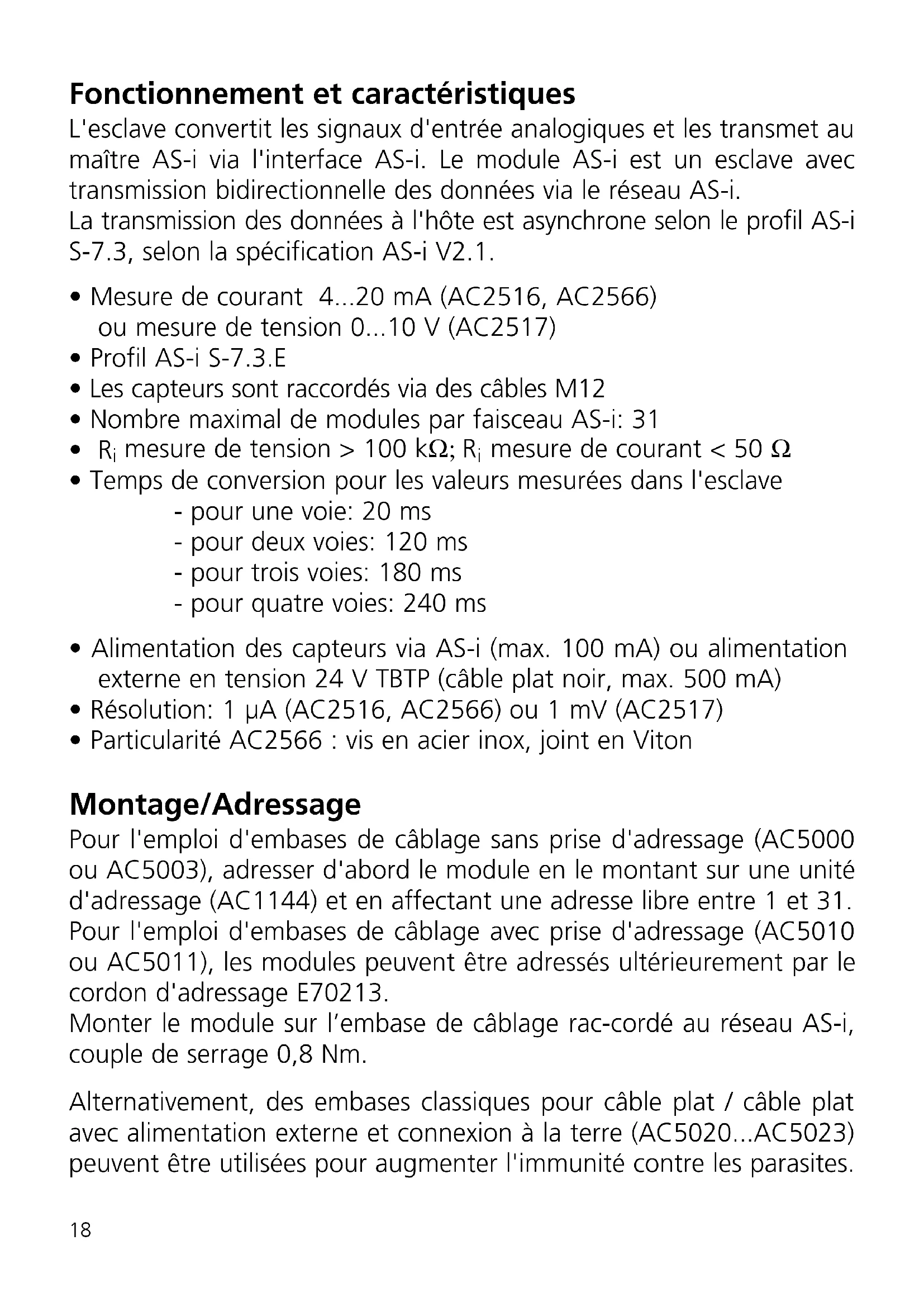 - Particularité AC2566 : vis en acier inox, joint en Viton Montage/Adressage Pour l'emploi d'embases de câblage sans prise d'adressage (AC5000 ou AC5003), adresser d'abord le module en le montant sur une unité d'adressage (AC1144) et en affectant une adresse libre entre 1 et 31. Pour l'emploi d'embases de câblage avec prise d'adressage (AC5010 ou AC5011), les modules peuvent être adressés ultérieurement par le cordon d'adressage E70213. Monter le module sur l’embase de câblage rac-cordé au réseau AS-i, couple de serrage 0,8 Nm. Alternativement, des embases classiques pour câble plat / câble plat avec alimentation externe et connexion à la terre (AC5020...AC5023) peuvent être utilisées pour augmenter l'immunité contre les parasites. 18Raccordement électrique Le module analogique est raccordé à l'interface AS-i via l'interface EMS standardisée (alimentation via AS-i) ou via l'interface E-EMS (alimenta- tion en tension externe 24 V TBTP). Pour une alimentation externe en 24 V une embase de câblage pour câble plat avec alimentation externe (AC5003 ou AC5011 ) doit être sélectionnée. En cas d'un total de plus de 100 mA pour l'alimentation de tous les capteurs, une alimentation externe en 24 V TBTP est néces- saire. L'alimentation est automatiquement changée quand la tension externe 24 V est appliquée.