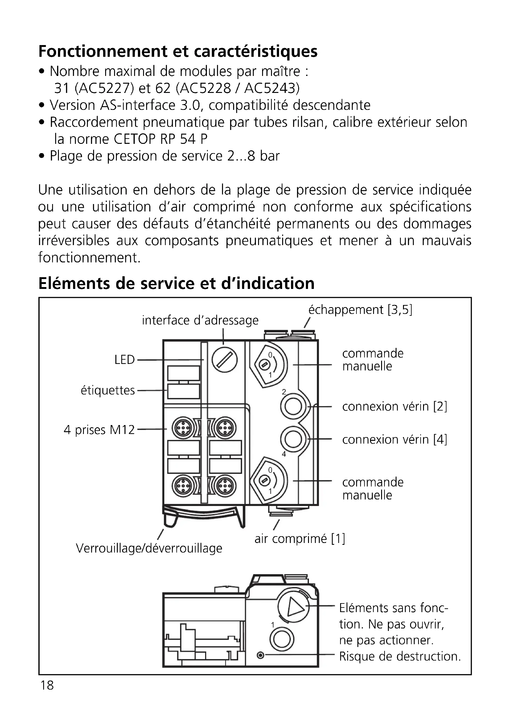 - Plage de pression de service 2...8 bar Une utilisation en dehors de la plage de pression de service indiquée ou une utilisation d’air comprimé non conforme aux spécifications peut causer des défauts d’étanchéité permanents ou des dommages irréversibles aux composants pneumatiques et mener à un mauvais fonctionnement. Eléments de service et d’indication