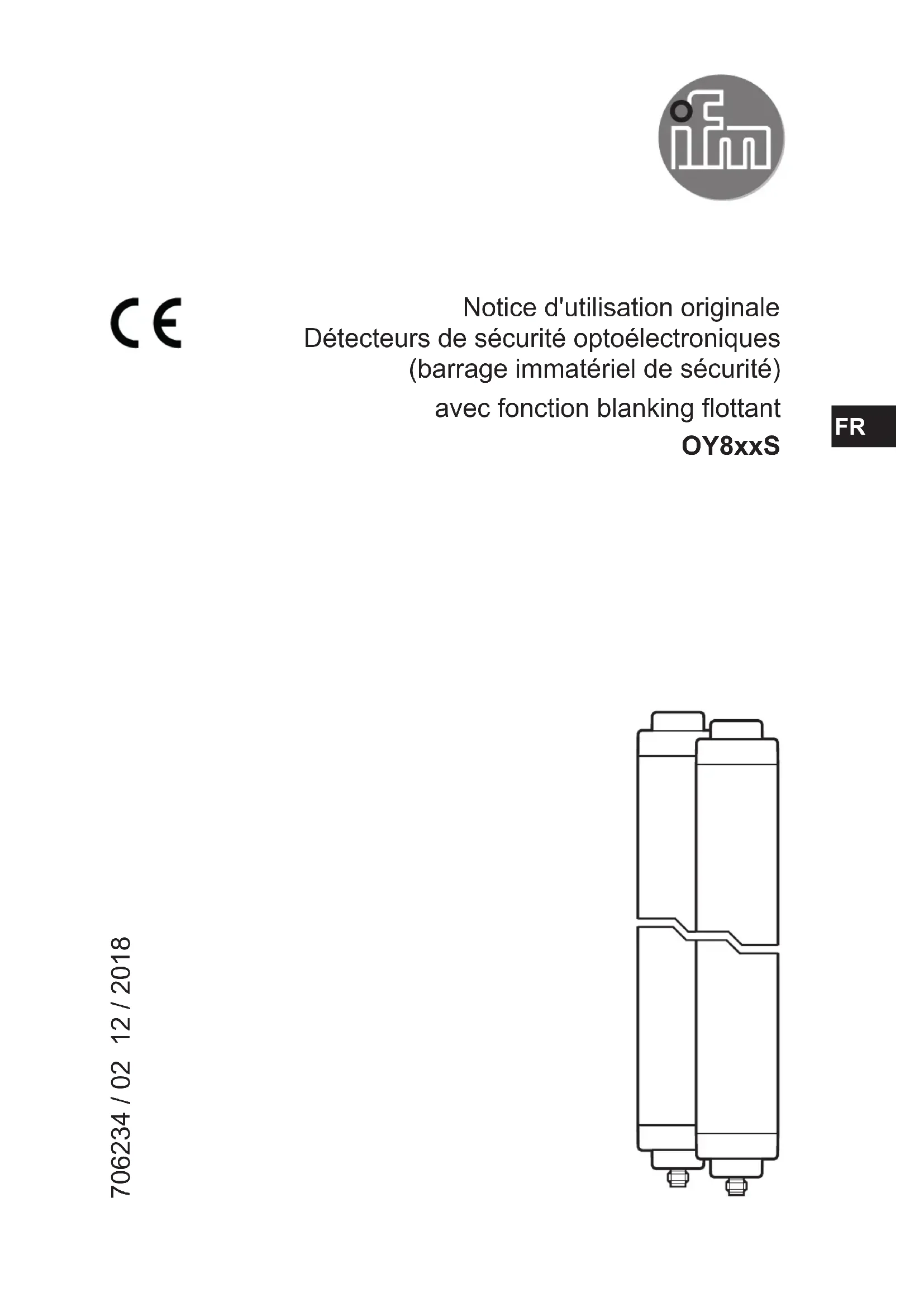 706234 / 02 12 / 2018 Notice d'utilisation originale Détecteurs de sécurité optoélectroniques (barrage immatériel de sécurité) avec fonction blanking flottant OY8xxS FR2 Contenu 1 Remarque préliminaire 4 11 Symboles utilisés 4 12 Avertissements utilisés 4 2 Consignes de sécurité 5 21 Exigences relatives à la sécurité de l'application 6 3 Fourniture 7 4 Fonctionnement et caractéristiques 7 5 Fonction 8 6 Montage 9 61 Notices de montage 9 62 Calcul de la distance de sécurité minimale 10 63 Montage vertical des barrages immatériels de sécurité 12 631 Barrages immatériels de sécurité résolution 14 mm 12 632 Barrages immatériels de sécurité résolutions 20 mm et 40 mm 12 633 Barrages immatériels de sécurité résolution 90 mm 13 64 Fixation et orientation optique 14 641 Orientation optique 14 65 Distance des surfaces réfléchissantes 15 66 Systèmes multiples 17 67 Utilisation de miroirs de renvoi 18 7 Raccordement électrique 19 71 Schéma de branchement émetteur 19 72 Schéma de branchement récepteur 20 8 Modes de fonctionnement 21 81 Fonction blanking flottant 21 811 Blanking sans objet permanent dans la zone protégée 23 812 Blanking avec objet permanent dans la zone protégée 26 82 Sélection du mode de fonctionnement 29 83 Fonction test 29 831 Fonction test interne 29 9 Eléments de service et d'indication 30 91 Etats LED303