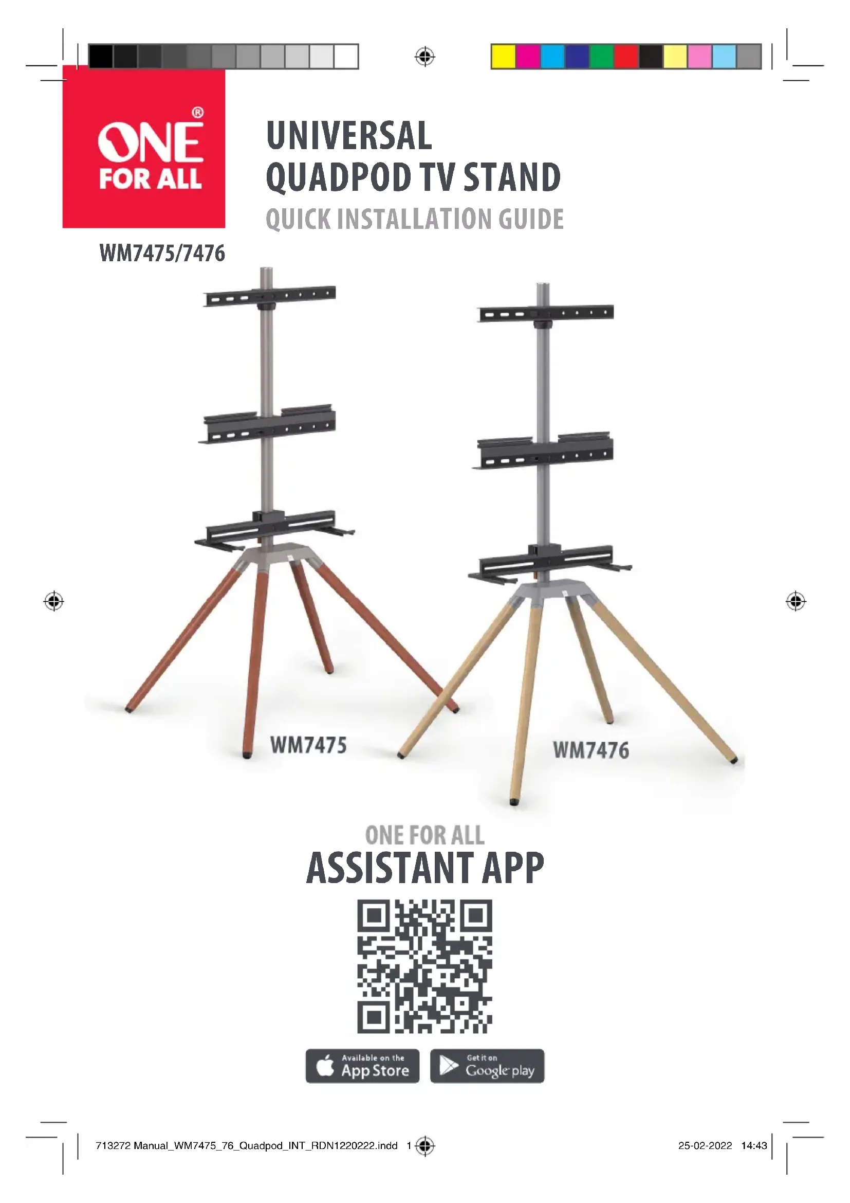 713272 Manual_WM7475_76_Quadpod_INT_RDN1220222.indd 13713272 Manual_WM7475_76_Quadpod_INT_RDN1220222.indd 13 25-02-2022 14:4325-02-2022 14:4314 FRANÇAIS Merci d’avoir fait l’acquisition de ce produit ONE FOR ALL ! Le produit que vous avez maintenant en votre possession est fabriqué avec des matériaux durables et sa conception a été pensée dans les moindres détails. C’est pourquoi ONE FOR ALL vous propose une garantie à vie contre tout vice de fabrication ou de matériaux.