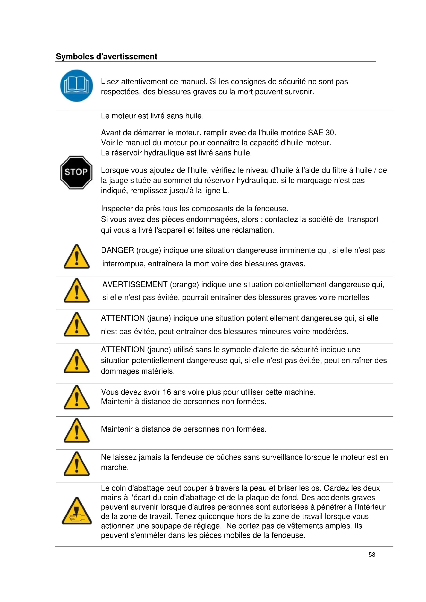 Avertissements importants avant le démarrage Avant de démarrer ou d’utiliser la fendeuse de bûches, lisez les instructions ci-dessous et toutes les informations de sécurité. Le non-respect de ces instructions peut entraîner des dommages matériels ou des blessures pour l'opérateur ou les personnes se trouvant à proximité. Faites attention aux avertissements de sécurité marqués du symbole: