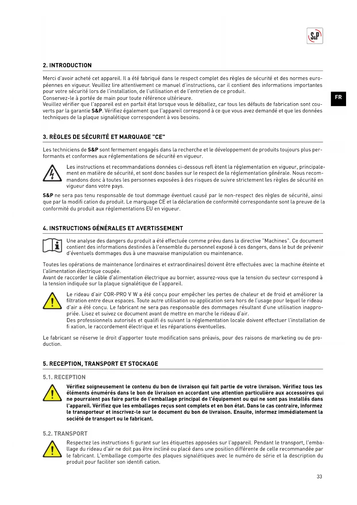 Merci d'avoir acheté cet appareil. Il a été fabriqué dans le respect complet des règles de sécurité et des normes euro- péennes en vigueur. Veuillez lire attentivement ce manuel d'instructions, car il contient des informations importantes pour votre sécurité lors de l'installation, de l'utilisation et de l'entretien de ce produit. Conservez-le à portée de main pour toute référence ultérieure. Veuillez vérifi er que l'appareil est en parfait état lorsque vous le déballez, car tous les défauts de fabrication sont cou- verts par la garantie S&P. Vérifi ez également que l'appareil correspond à ce que vous avez demandé et que les données techniques de la plaque signalétique correspondent à vos besoins.