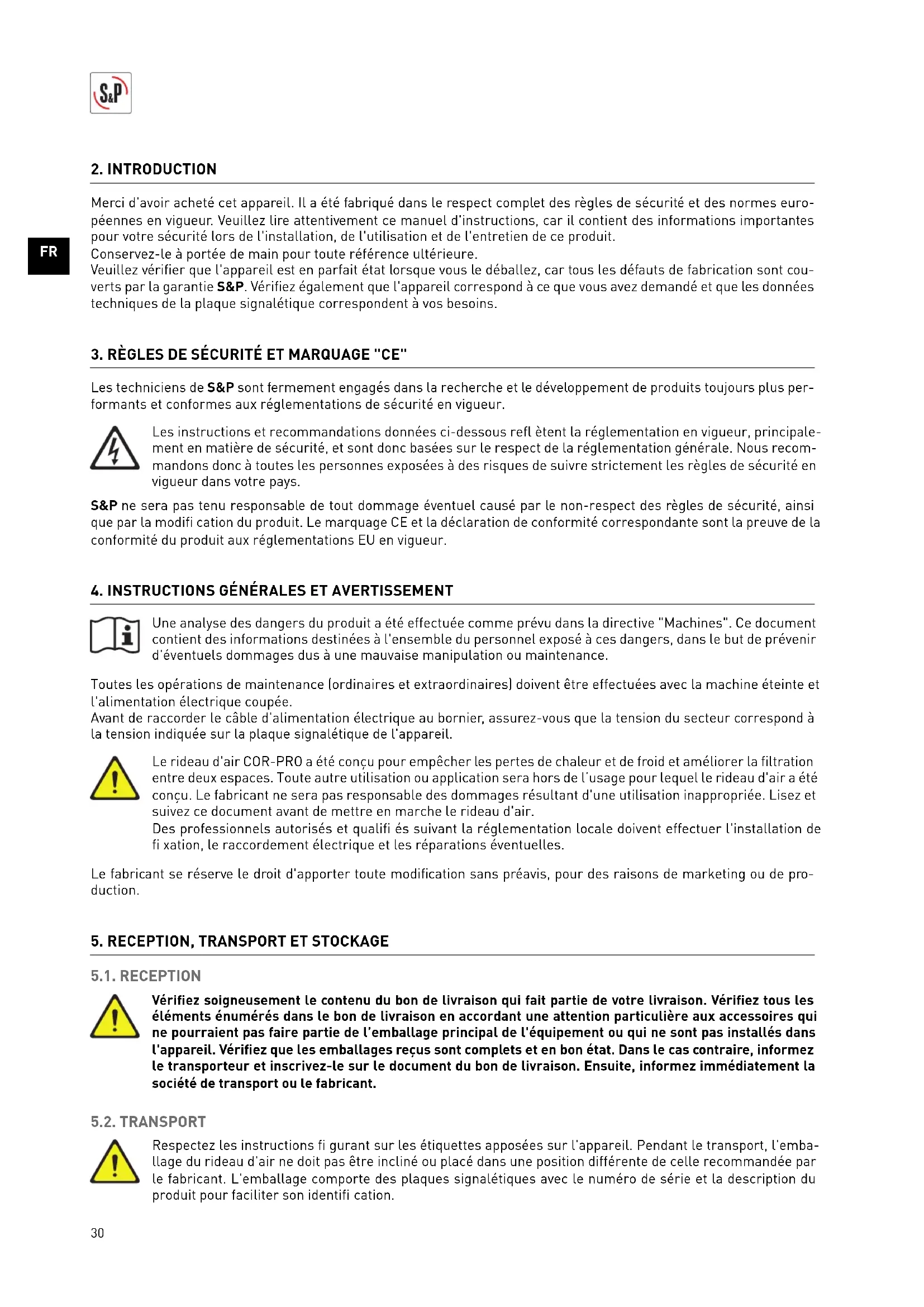 Les techniciens de S&P sont fermement engagés dans la recherche et le développement de produits toujours plus per- formants et conformes aux réglementations de sécurité en vigueur. Les instructions et recommandations données ci-dessous refl ètent la réglementation en vigueur, principale- ment en matière de sécurité, et sont donc basées sur le respect de la réglementation générale. Nous recom- mandons donc à toutes les personnes exposées à des risques de suivre strictement les règles de sécurité en vigueur dans votre pays. S&P ne sera pas tenu responsable de tout dommage éventuel causé par le non-respect des règles de sécurité, ainsi que par la modifi cation du produit. Le marquage CE et la déclaration de conformité correspondante sont la preuve de la conformité du produit aux réglementations EU en vigueur.