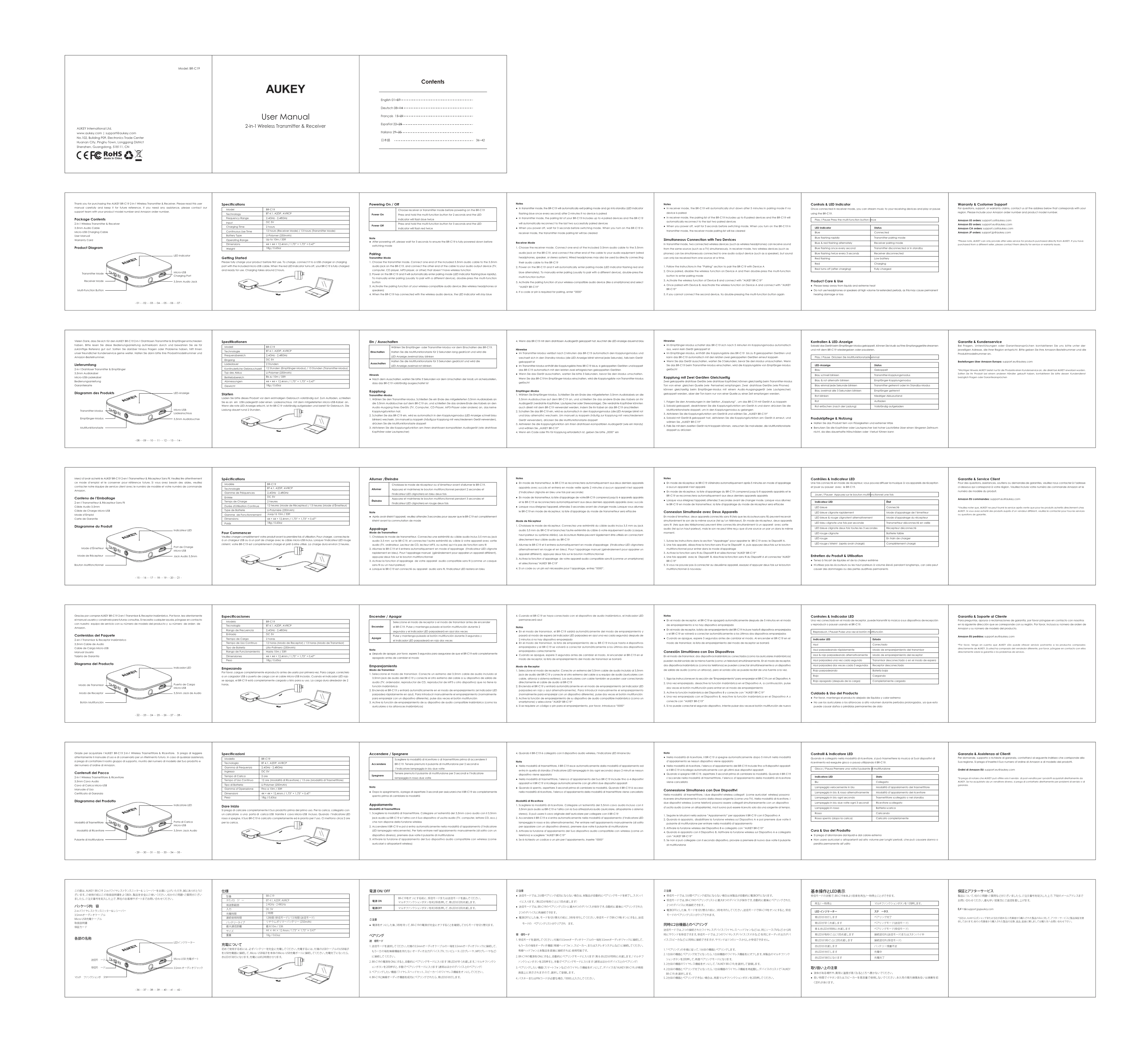 doppelt zu drücken Kontrollen & LED-Anzeige Sobald das Gerät beim Empfänger-Modus gekoppelt, können Sie Musik auf Ihre Empfangsgeräte streamen und mit dem BR-C19 wiedergeben oder pausieren.Play / Pause Drücken Sie Multifunktionstaste einmalLED-AnzeigeBlau Blau schnell blinkenBlau & rot alternativ blinkenBlau einmal jede Sekunde blinkenBlau zweimal alle 3 Sekunden blinkenRot blinken Rot Rot erlöschen (nach der Ladung)StatusGekoppeltTransmitter-KopplungsmodusEmpfänger-KopplungsmodusTransmitter getrennt oder im Standby-ModusEmpfänger getrenntNiedriger AkkuzustandAufladenVollständig aufgeladen Produktpflege & Nutzung ● Halten Sie das Produkt fern von Flüssigkeiten und extremer Hitze ● Benutzen Sie die Kopfhörer oder Lautsprecher bei hoher Lautstärke über einen längeren Zeitraum nicht, da dies dauerhafte Hörschäden oder -Verlust führen kann Garantie & Kundenservice Bei Fragen, Unterstützungen oder Garantieansprüchen kontaktieren Sie uns bitte unter der jeweiligen Adresse, die Ihrer Region entspricht. Bitte geben Sie Ihre Amazon-Bestellnummer und die Produktmodellnummer an.Bestellungen über Amazon Europa: support.eu@aukey.com *Wichtiger Hinweis: AUKEY bietet nur für die Produkte einen Kundenservice an, die direkt bei AUKEY erworben wurden. Sollten Sie Ihr Produkt bei einem anderen Händler gekauft haben, kontaktieren Sie bitte dessen Kundendienst bezüglich Fragen oder Garantieansprüchen- 08 - - 09 - - 10 - - 11 - - 12 - - 13 - - 14 - Merci d’avoir acheté le AUKEY BR-C19 2-en-1 Transmetteur & Récepteur Sans Fil. Veuillez lire attentivement ce mode d’emploi et le conserver pour référence future. Si vous avez besoin des aides, veuillez contacter notre équipe de service client avec le numéro de modèle et votre numéro de commande Amazon. Contenu de l’Emballage 2-en-1 Transmetteur & Récepteur Sans FilCâble Audio 3,5mm Câble de Charge Micro-USB Mode d’Emploi Carte de Garantie Diagramme du Produit Mode de RécepteurBouton MultifonctionnelMode d’ÉmetteurIndicateur LEDPort de ChargeMicro-USB Jack Audio 3,5mm Spécifications Modèle Technologie Gamme de FréquencesEntrée Temps de ChargeDurée d'Utilisation ContinueType de BatterieGamme de FonctionnementDimensionsPoids BR-C19BT 4,1, A2DP, AVRCP2,4GHz - 2,48GHzDC 5V2 heures12 heures (Mode de Récepteur) / 13 heures (Mode d’Émetteur)Li-Polymère (250mAh)Jusqu’à 10m / 33ft44 × 44 × 12,4mm / 1,73” × 1,73” × 0,47”18g / 0,63oz Pour Commencer Veuillez charger complètement votre produit avant la première fois d’utilisation. Pour charger, connectez-le à un chargeur USB ou à un port de charge avec le câble micro-USB inclus. Lorsque l’indicateur LED rouge s'éteint, votre BR-C19 est complètement chargé et prêt à être utilisé. La charge dura environ 2 heures. Allumer /Éteindre AllumerÉteindre Choisissez le mode de récepteur ou d’émetteur avant d'allumer le BR-C19. Appuyez et maintenez le bouton multifonctionnel pendant 2 secondes et l'indicateur LED clignotera en bleu deux foisAppuyez et maintenez le bouton multifonctionnel pendant 3 secondes et l'indicateur LED clignotera en rouge deux foisNote ● Après avoir éteint l’appareil, veuillez attendre 3 secondes pour assurer que le BR-C19 est complètement éteint avant la commutation de mode Appairage Mode de Transmetteur