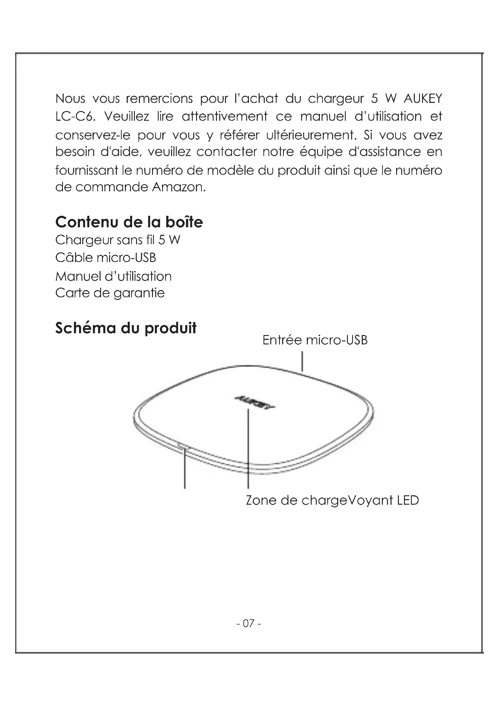 Produktpflege Anzeige grün rot blinkt rot Status Wird geladen/vollständig geladen Stand-by Ladefehler LED-Anzeige- 07 - Nous vous remercions pour l’achat du chargeur 5 W AUKEY LC-C6. Veuillez lire attentivement ce manuel d’utilisation et conservez-le pour vous y référer ultérieurement. Si vous avez besoin d'aide, veuillez contacter notre équipe d'assistance en fournissant le numéro de modèle du produit ainsi que le numéro de commande Amazon. Contenu de la boîte Chargeur sans fil 5W Câble micro-USB Manuel d’utilisation Carte de garantie Schéma du produit Entrée micro-USB Zone de chargeVoyant LED- 08 - Connectez la station de charge LC-C6 à une prise murale avec un chargeur mural USB (non inclus) et le câble micro-USB fourni. Le voyant LED s'allumera en rouge. Placez votre téléphone compatible avec Qi sur la station de charge sans fil. Le voyant LED s'allumera en vert et votre téléphone commencera à charge à la vitesse de charge sans fil standard. Chargement sans fil pour téléphones non compatibles avec le chargement sans fil Un récepteur de charge sans fil (non inclus) est nécessaire pour les téléphones non compatibles avec le système de chargement sans fil.