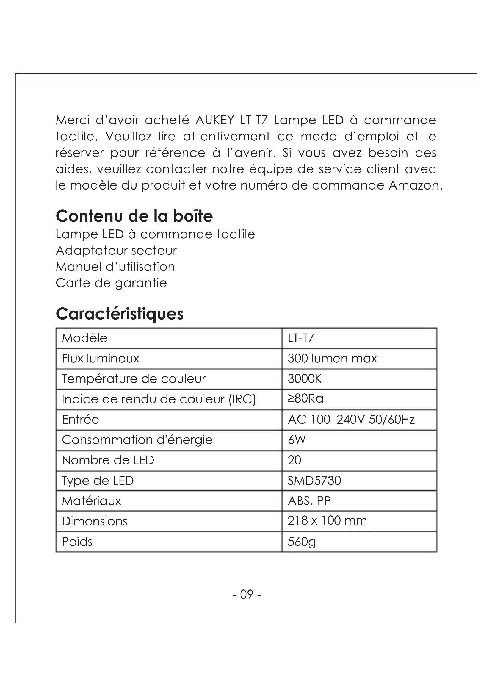 Merci d'avoir acheté AUKEY LT-T7 Lampe LED à commande tactile. Veuillez lire attentivement ce mode d'emploi et le réserver pour référer à l'avirr. Si vous avez besoin d'aides, veuillez contacter notre équipe de service client avec le modèle du produit et votre numéro de commande Amazon.