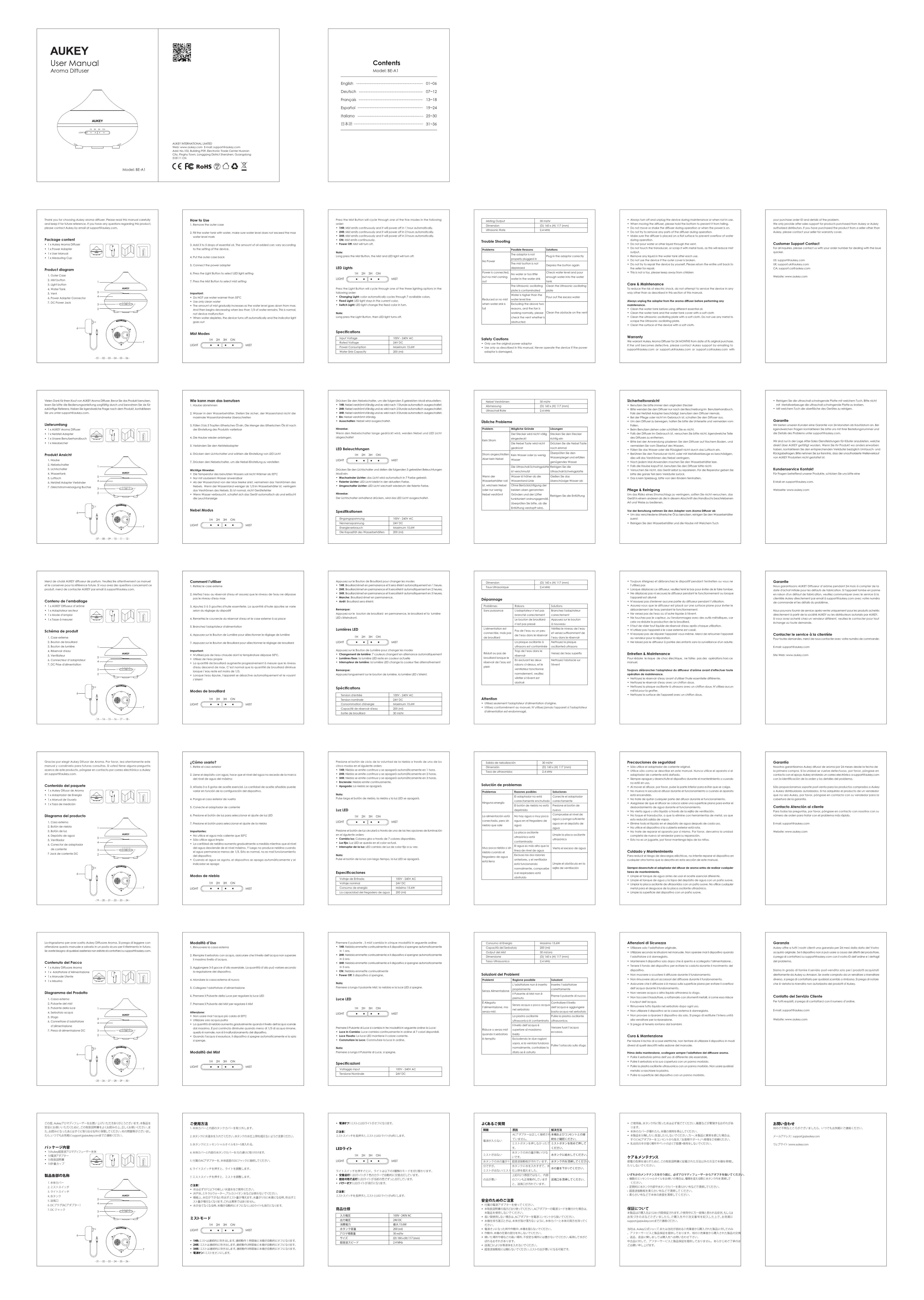 - Nettoyez la plaque oscillante à ultrasons avec un chiffon doux. N’utilisez aucun métal pour la gratter.• Nettoyez la surface de l'appareil avec un chiffon doux.Garantie Nous garantissons AUKEY Diffuseur d’arôme pendant 24 mois à compter de la date d'achat initiale pour les défauts de fabrication. Si l'appareil tombe en panne en raison d'un défaut de fabrication, veuillez communiquer avec le service à la clientèle Aukey directement par email à support@aukey.com avec votre numéro de commande et les détails du problème. Nous pouvons fournir de service après-vente uniquement pour les produits achetés directement à partir de la société AUKEY ou les distributeurs autorisés par AUKEY. Si vous avez acheté chez un vendeur différent, veuillez le contacter pour tout échange ou toute demande.Contacter le service à la clientèle Pour toutes demandes, merci de nous contacter avec votre numéro de commande: E-mail: support@aukey.comSite Web: www.aukey.comDimensionTaux Ultrasonique(D) 160 x (H) 117 (mm)2.4 MHz Gracias por elegir Aukey Difusor de Aroma. Por favor, lea atentamente este manual y consérvelo para futuras consultas. Si usted tiene alguna pregunta acerca de este producto, póngase en contacto por correo electrónico a Aukey en support@aukey.com.Contenido del paquete• 1 x Aukey Difusor de Aroma• 1 x Adaptador de Energía • 1 x Manual de Usuario• 1 x Taza de mediciónDiagrama del producto1. Caso externo2. Botón de niebla3. Botón de luz4. Depósito de agua5. Ventilador6. Conector de adaptador de corriente7 Jack de corriente DC¿Cómo usarlo?1. Retire el caso exterior
