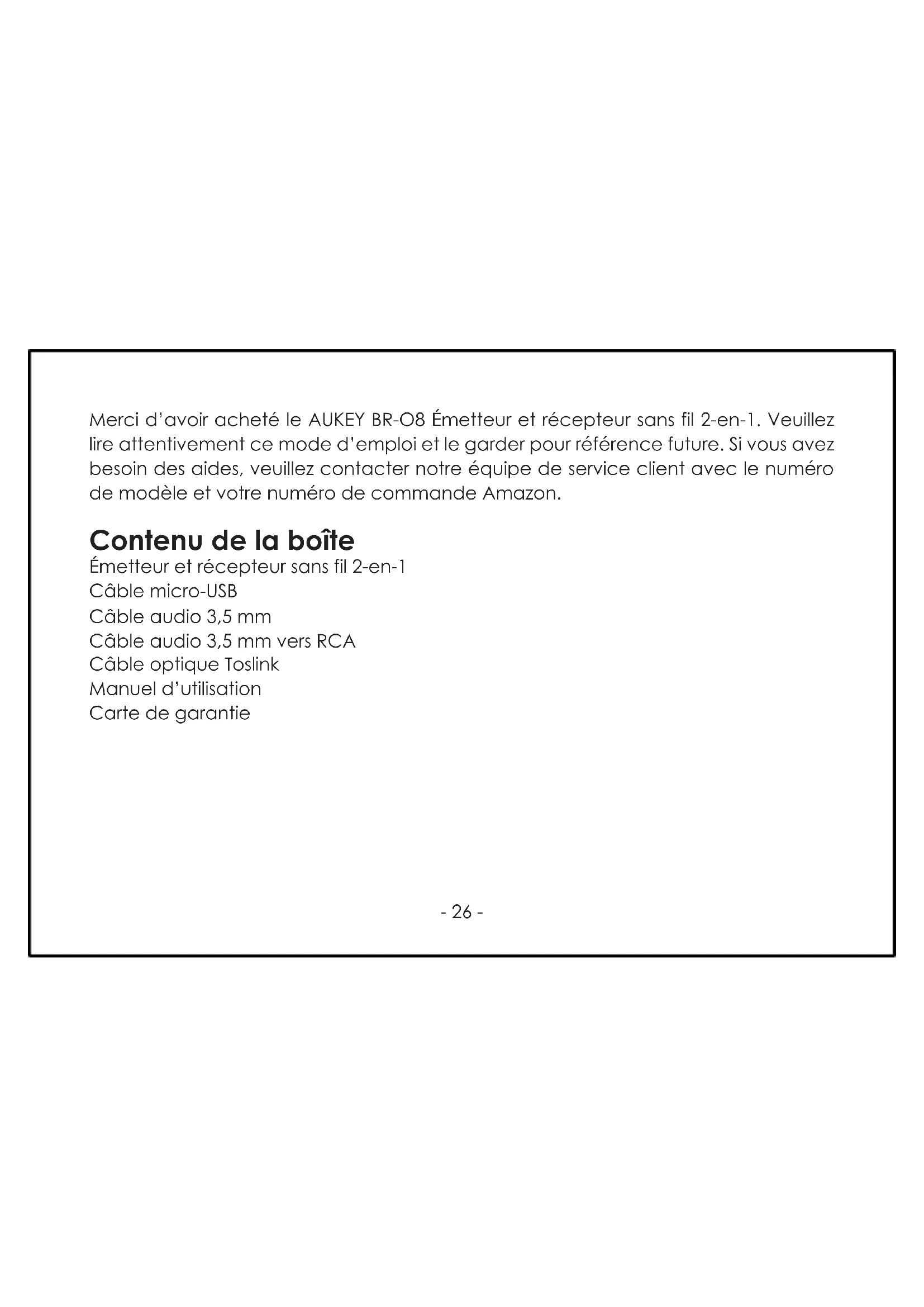 Merci d'avoir acheté le AUKEY BR-O8 Émetteur et récepteur sans fil 2-en-1. Veuillez lire attentivement ce mode d'emploi et le garder pour référence future. Si vous avez besoin d'aides, veuillez contacter notre équipe de service client avec le numéro de modèle et votre numéro de commande Amazon.