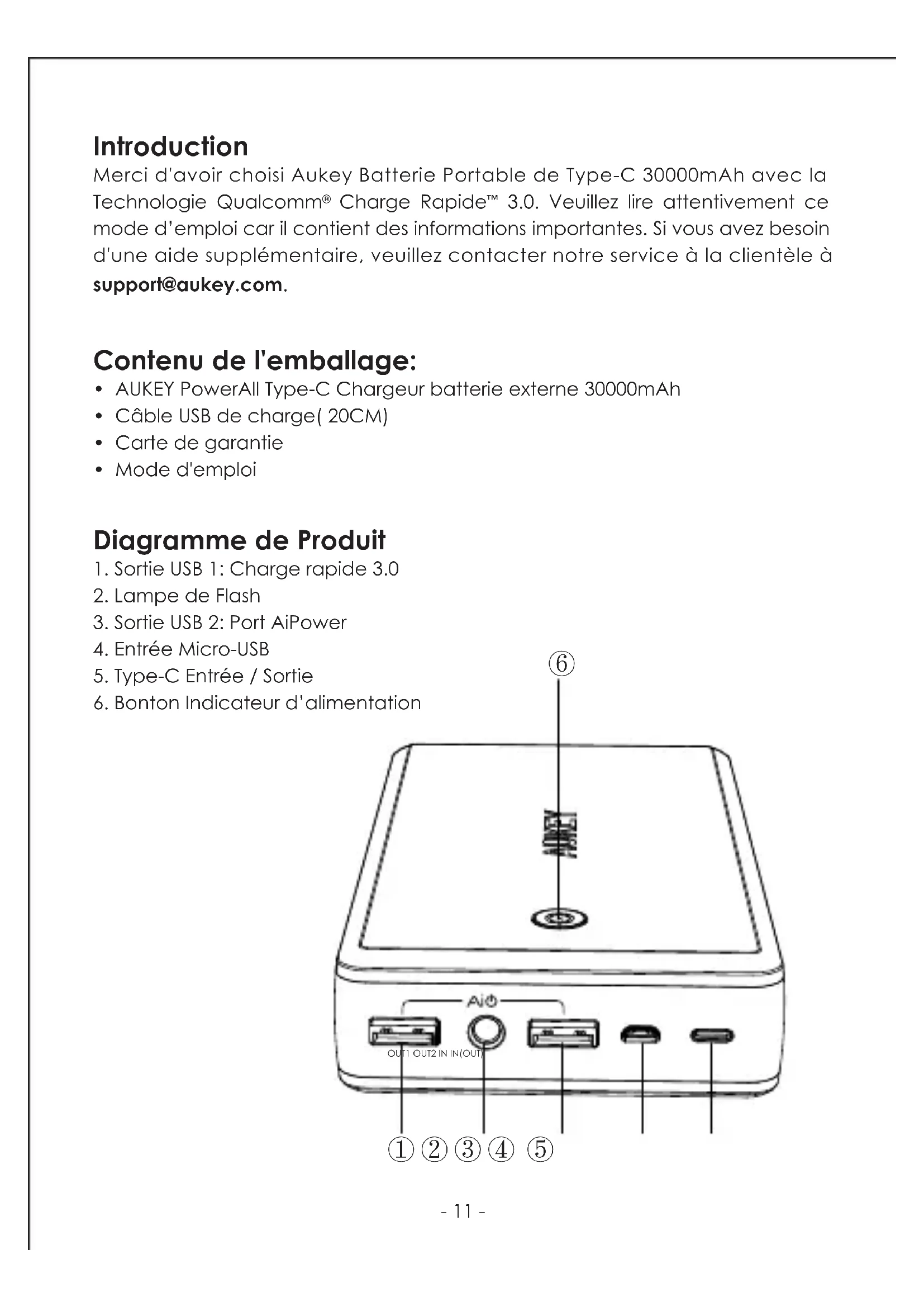 3.0. Veuillez lire attentivement ce mode d’emploi car il contient des informations importantes. Si vous avez besoin d'une aide supplémentaire, veuillez contacter notre service à la clientèle à support@aukey.com. Contenu de l'emballage: