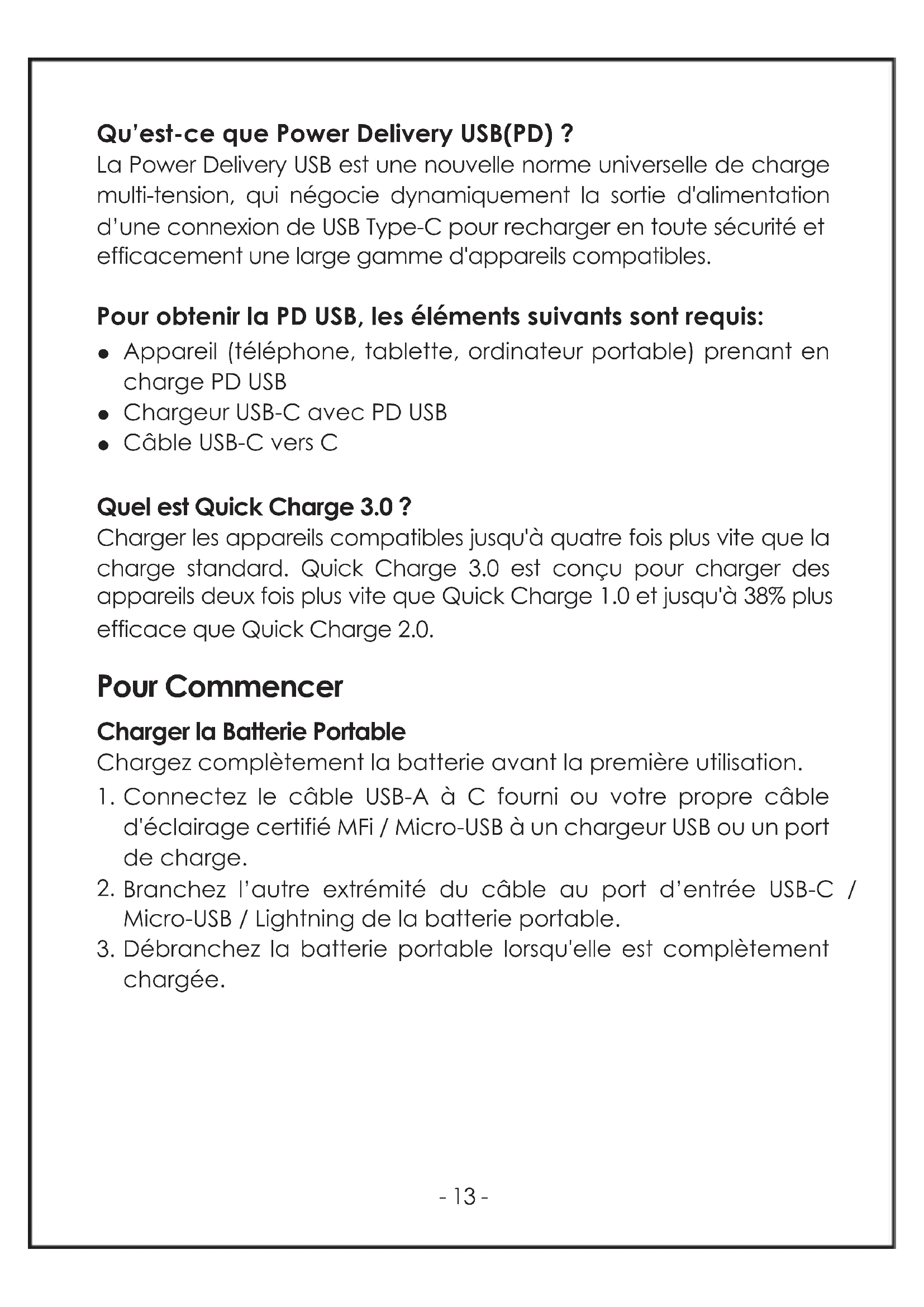 Quel est Quick Charge 3.0 ? Charger les appareils compatibles jusqu'à quatre fois plus vite que la charge standard. Quick Charge 3.0 est conçu pour charger des appareils deux fois plus vite que Quick Charge 1.0 et jusqu'à 38% plus efficace que Quick Charge 2.0. Pour Commencer Charger la Batterie Portable Chargez complètement la batterie avant la première utilisation. Qu’est-ce que Power Delivery USB(PD) ? La Power Delivery USB est une nouvelle norme universelle de charge multi-tension, qui négocie dynamiquement la sortie d'alimentation d’une connexion de USB Type-C pour recharger en toute sécurité et efficacement une large gamme d'appareils compatibles. Pour obtenir la PD USB, les éléments suivants sont requis: Appareil (téléphone, tablette, ordinateur portable) prenant en charge PD USB Chargeur USB-C avec PD USB Câble USB-C vers C Connectez le câble USB-A à C fourni ou votre propre câble d'éclairage certifié MFi / Micro-USB à un chargeur USB ou un port de charge. Branchez l’autre extrémité du câble au port d’entrée USB-C / Micro-USB / Lightning de la batterie portable. Débranchez la batterie portable lorsqu'elle est complètement chargée.