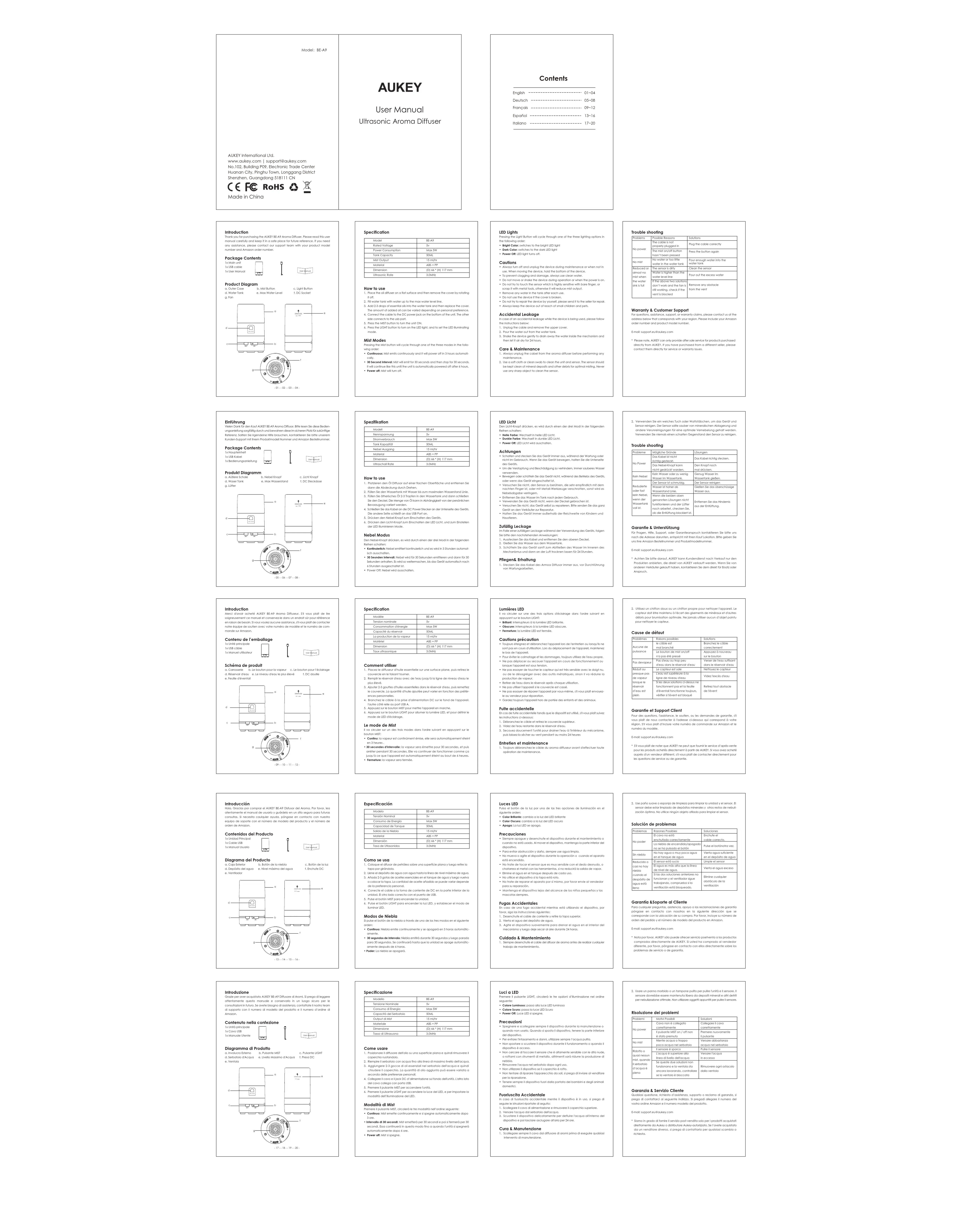 - 09 - - 10 - - 11 - - 12 - Introduction Merci d'avoir acheté AUKEY BE-A9 Aroma Diffuseur. S'il vous plaît de lire soigneusement ce manuel et conservez-le dans un endroit sûr pour référence en raison de besoin. Si vous voulez aucune assistance, s'il vous plaît de contacter notre équipe de soutien avec votre numéro de modèle et le numéro de com-mande sur Amazon. Contenu de l’emballage 1x Unité principale1x USB câble1x Manuel utilisateur Schéma de produit a. Carrosserie b. Le bouton pour la vapeur c. Le bouton pour l’éclairaged. Réservoir d'eau e. Le niveau d'eau le plus élevé f. DC douillee. Feuille d'éventailModèleTension nominaleConsommation d'énergieCapacité du réservoirLa production de la vapeurMatérielDimensionTaux ultrasoniqueBE-A9 Max 5W 50ML 15 ml/hrABS + PP(D) 66 * (H) 117 mm3.0MHz Specification Comment utiliser