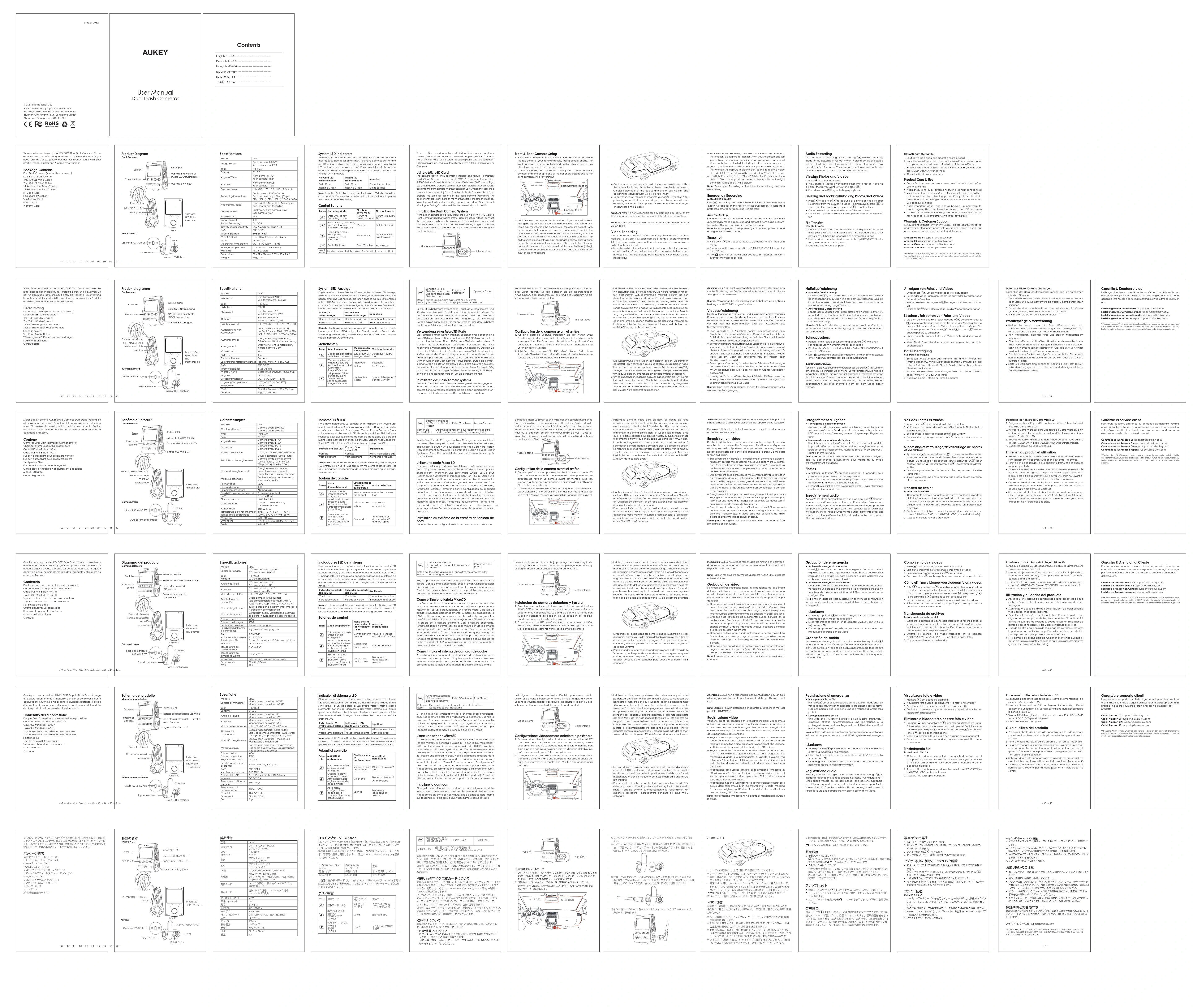 Rear CameraRückfahrkamera Configuration de la caméra avant et arrière Hinweis: Time-Lapse Aufzeichnung ist nicht für Überwachungszwecke während der Fahrt geeignet. Notfallaufzeichnung Merci d’avoir acheté AUKEY DRS2 Caméras Dual-Dash. Veuillez lire attentivement ce mode d’emplois et le conserver pour référence future. Si vous avez besoin des aides, veuillez contacter notre équipe de service client avec le numéro du modèle et votre numéro de commande Amazon. Contenu Caméras Dual-Dash (caméras avant et arrière)Chargeur allume-cigare USB à deux portsCâble USB Mini-B de 4m/13ftCâble USB Mini-B de 7m/23ftSupport autocollant pour la caméra frontaleSupport autocollant pour la caméra arrièreSix clips de câbleQuatre autocollants de rechange3MOutil d’aide à l’installation et ajustement des câbles Manuel utilisateurCarte de garantie Caractéristiques Indicateurs à LED Il y a deux indicateurs. La caméra avant dispose d’un voyant LED orienté vers l’extérieur (pour signaler aux autres utilisateurs que votre caméra est active) et d’un témoin LED orienté vers l’intérieur (pour votre référence). Le voyant LED de sortie peut être éteint si vous souhaitez pour que le système de caméra de tableau de bord soit moins visible pour les personnes extérieures. Sélectionnez Configura-tion > LED détectable > sélectionnez Non > appuyez sur OK.Remarque: en mode de détection de mouvement, seul le voyant LED entrant est en veille. Une fois qu’un mouvement est détecté, les deux indicateurs fonctionneront de la même manière qu’un enregis-trement normal. Boutons de contrôle Il existe 3 options d’affichage: double affichage, caméra frontale et caméra arrière. Lorsque la caméra de tableau de bord est allumée, appuyez sur le bouton OK pour changer de vue ou éteindre l’écran (l’enregistrement continuera). Le paramètre « Écran de veille » peut également être utilisé pour éteindre automatiquement l’écran après 1 ou 3 minutes. Utiliser une carte Micro SD La caméra n’inclut pas de mémoire interne et nécessite une carte micro SD (classe 10+ recommandée et 128 Go maximum pris en charge) pour fonctionner. Une carte micro SD de 128 Go peut stocker environ 20 heures d’enregistrementsen 1080 p. Utilisez une carte de haute qualité et de marque pour une fiabilité maximale. Insérez une carte micro SD dans le logement pour carte micro SD de l’appareil photo avant. Ensuite, lorsque la caméra est allumée, formatez-la (option « Formater » dans « Configuration de la caméra de tableau de bord ») pour préparer la carte à la première utilisation avec la caméra de tableau de bord. Le formatage effacera définitivement toutes les données de la carte micro SD. Pour de meilleures performances, formatez-la régulièrement (après avoir sauvegardé tous les fichiers importants). « Avertissement de formatage » dans « Paramètres » peut être activé pour vous rappeler de le faire. Installation du système de la caméra de tableau de bord Les instructions de configuration de la caméra avant et arrière sont Indicateur d’état LEDVoyant d’état entrant LEDExplicationsVert fixeVert clignotantVert fixeVert clignotantActif ; n’enregistre pasActif ; enregistrementBoutonDescendreMode de lectureListe de lecture et menu de configurationMode d’enregistrementDéplacer vers le hautRetour au menuprécédentEntrer en mode d’enregistrement d’urgenceoir la liste de lecture (pression courte)Activer/désactiver l’enregistrement audio (appui long)Ouvrir le menu de configuration (pression courte)Prendre une photo (appui long)Supprimer/rembobinerVerrouillage et déverrouillage/avance rapideRetour à la playlist/ Stop Entrer/ConfirmerBasculer l’affichage de l’écran et éteindrel’écranLecture/pauseBouton de réinitialisationAppuyez brièvement pour redémarrer l’appareil (cela n’affectera pas les fichiers enregistrés)Installez la caméra arrière dans en haut, au centre de votre pare-brise, en direction de l’arrière. La caméra arrière est montée avec son support d’autocollant à position fixe. Alignez correctement le connecteur de la caméra sur la forme de son trou et poussez fermement la caméra arrière dans le support (de manière à ce qu’elle se clipse dans les deux clips de fixation du support). Enfoncez fermement l’extrémité du port du câble USB Mini-B de 7m/23ft dans la fente rectangulaire du côté opposé du support, en veillant à l’orientation correcte adaptée au connecteur de la caméra arrière. La monture permet de faire pivoter la caméra arrière vers le haut ou vers le bas (tenez la monture pendant le réglage). Branchez l’extrémité du connecteur en forme de L du câble sur l’entrée USB Mini-B AV de la caméra avant. L’acheminement des câbles doit être conforme aux schémas ci-dessus. Utilisez les serre-câbles pour aider à fixer les deux câbles de manière pratique et sécurisée. Une mise en place soignée des câbles et l’utilisation de garnitures et de tapis existants pour les dissimuler donneront une finition plus ordonnée.Pour allumer, insérez le chargeur de voiture dans la priseallume-cig- are 12V de votre voiture. Après avoir allumé chaque fois que vous démarrerez votre voiture, le système commencera à enregistrer automatiquement. Pour éteindre, débranchez le chargeur de voiture ou le câble USB mini-B connecté.