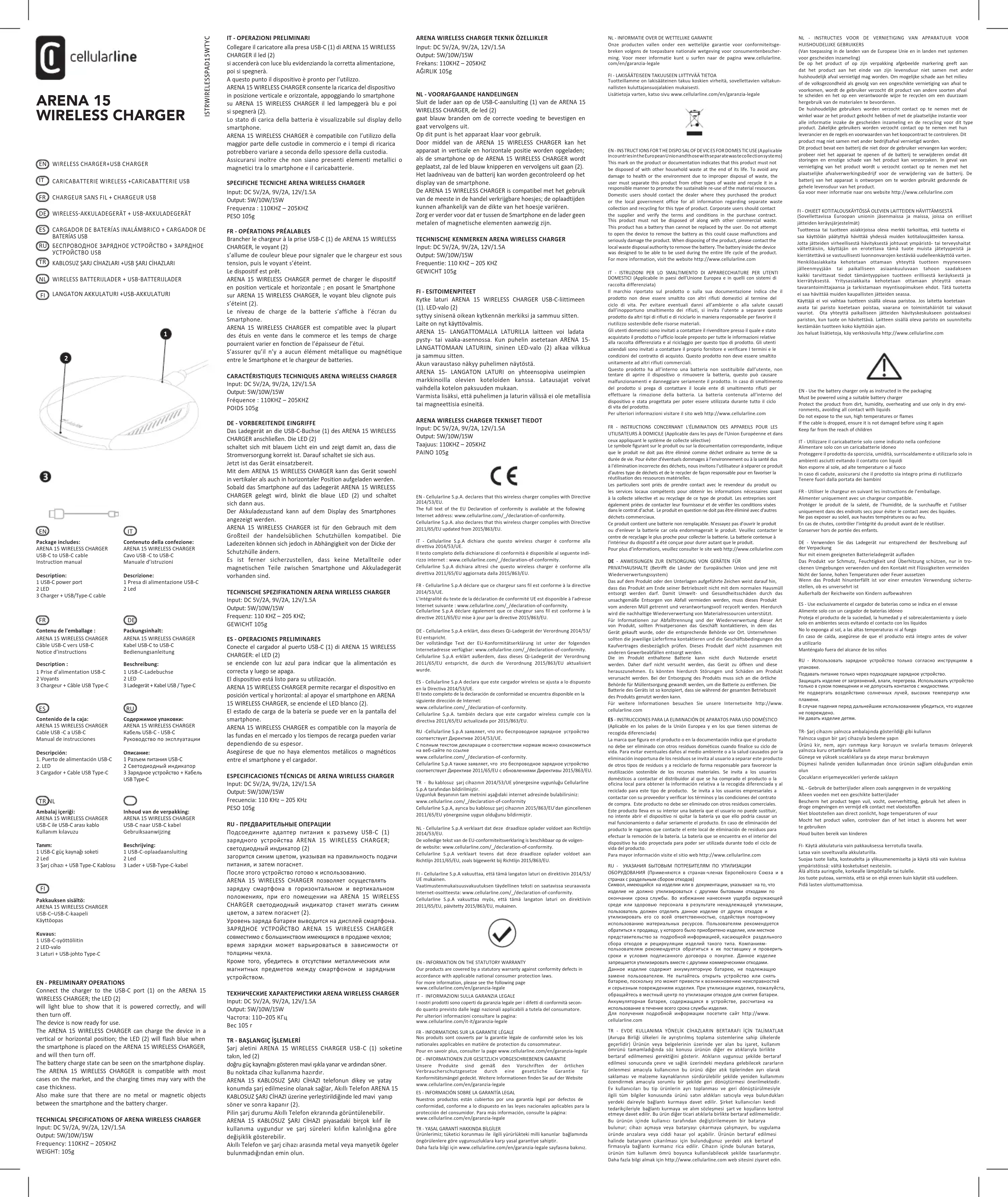 FR - Utiliser le chargeur en suivant les instructions de l’emballage. Alimenter uniquement avec un chargeur compatible. Protéger le produit de la saleté, de l’humidité, de la surchauffe et l’utiliser uniquement dans des endroits secs pour éviter le contact avec des liquides. Ne pas exposer au soleil, aux hautes températures ou au feu. En cas de chutes, contrôler l’intégrité du produit avant de le réutiliser. Conserver hors de portée des enfants. FR - Cellularline S.p.A déclare que ce chargeur sans fil est conforme à la directive 2014/53/UE. L'intégralité du texte de la déclaration de conformité UE est disponible à l'adresse Internet suivante : www.cellularline.com/_/declaration-of-conformity. Cellularline S.p.A déclare également que ce chargeur sans fil est conforme à la directive 2011/65/EU mise à jour par la directive 2015/863/EU. FR - INFORMATIONS SUR LA GARANTIE LÉGALE Nos produits sont couverts par la garantie légale de conformité selon les lois nationales applicables en matière de protection du consommateur. Pour en savoir plus, consulter la page www.cellularline.com/en/garanzia-legale