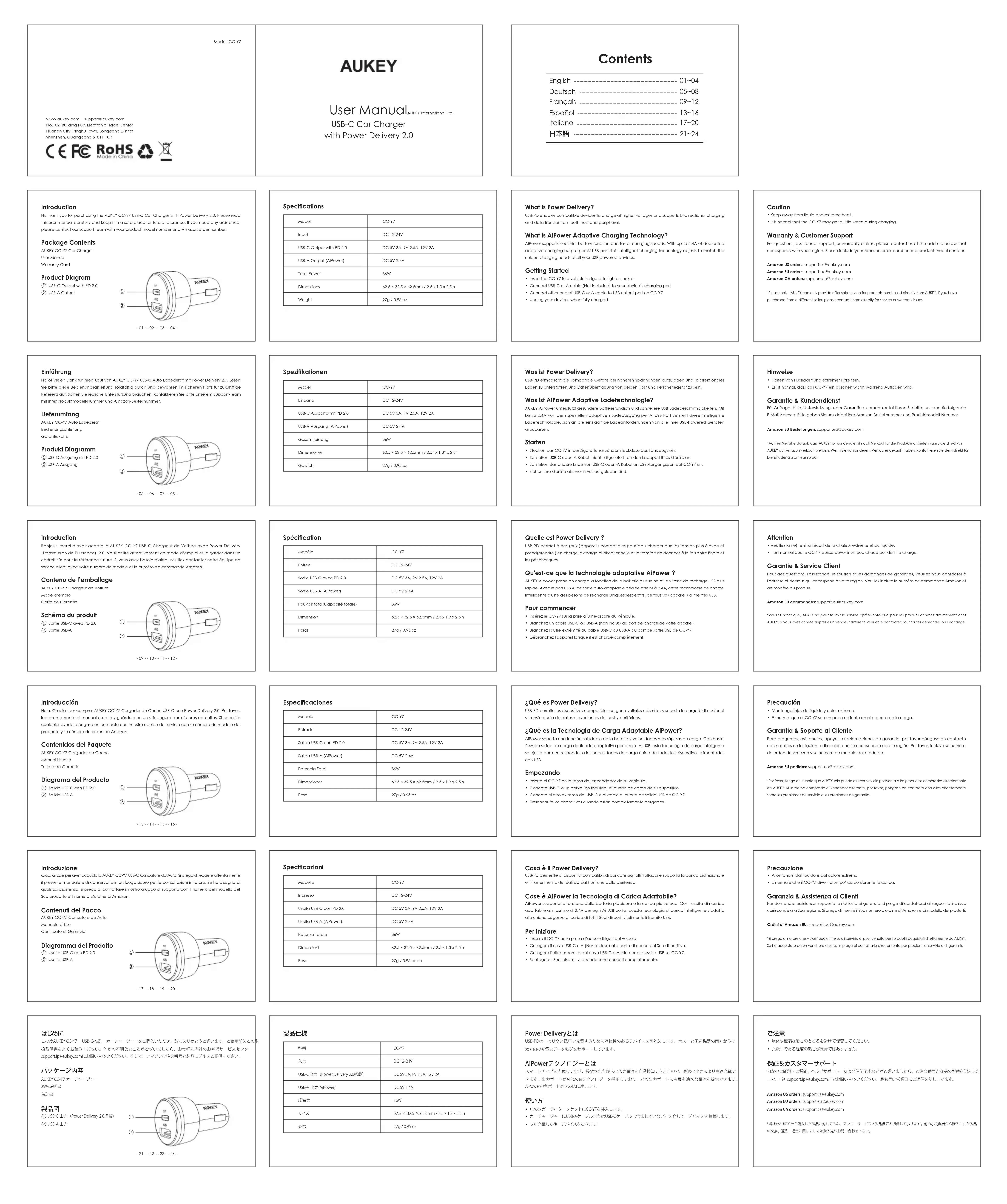 - Halten von Flüssigkeit und extremer Hitze fern.• Es ist normal, dass das CC-Y7 ein bisschen warm während Aufladen wird. Garantie&Kundendienst FürAnfrage,Hilfe,Unterstützung,oderGarantieanspruchkontaktierenSiebitteunsperdiefolgende E-MailAdresse.BittegebenSieunsdabeiIhreAmazonBestellnummerundProduktmodell-Nummer.AmazonEUBestellungen: support.eu@aukey.com*AchtenSiebittedarauf,dassAUKEYnurKundendienstnachVerkauffürdieProdukteanbietenkann,diedirektvonAUKEYaufAmazonverkauftwerden.WennSievonanderemVerkäufergekaufthaben,kontaktierenSiedemdirektfürDienstoderGarantieanspruch. Introduction Bonjour, merci d'avoir acheté le AUKEY CC-Y7 USB-C Chargeur de Voiture avec Power Delivery (Transmission de Puissance) 2.0. Veuillez lire attentivement ce mode d’emploi et le garder dans un endroit sûr pour la référence future. Si vous avez besoin d'aide, veuillez contacter notre équipe de service client avec votre numéro de modèle et le numéro de commande Amazon. Contenu de l’emballage AUKEY CC-Y7 Chargeur de Voiture Mode d’emploi Carte de Garantie Schéma du produit ① Sortie USB-C avec PD 2.0② Sortie USB-A Spécification Modèle Entrée Sortie USB-C avec PD 2.0Sortie USB-A (AiPower)Pouvoir total(Capacité totale)Dimension Poids CC-Y7DC 12-24V DC 5V 3A, 9V 2.5A, 12V 2ADC 5V 2.4A 36W