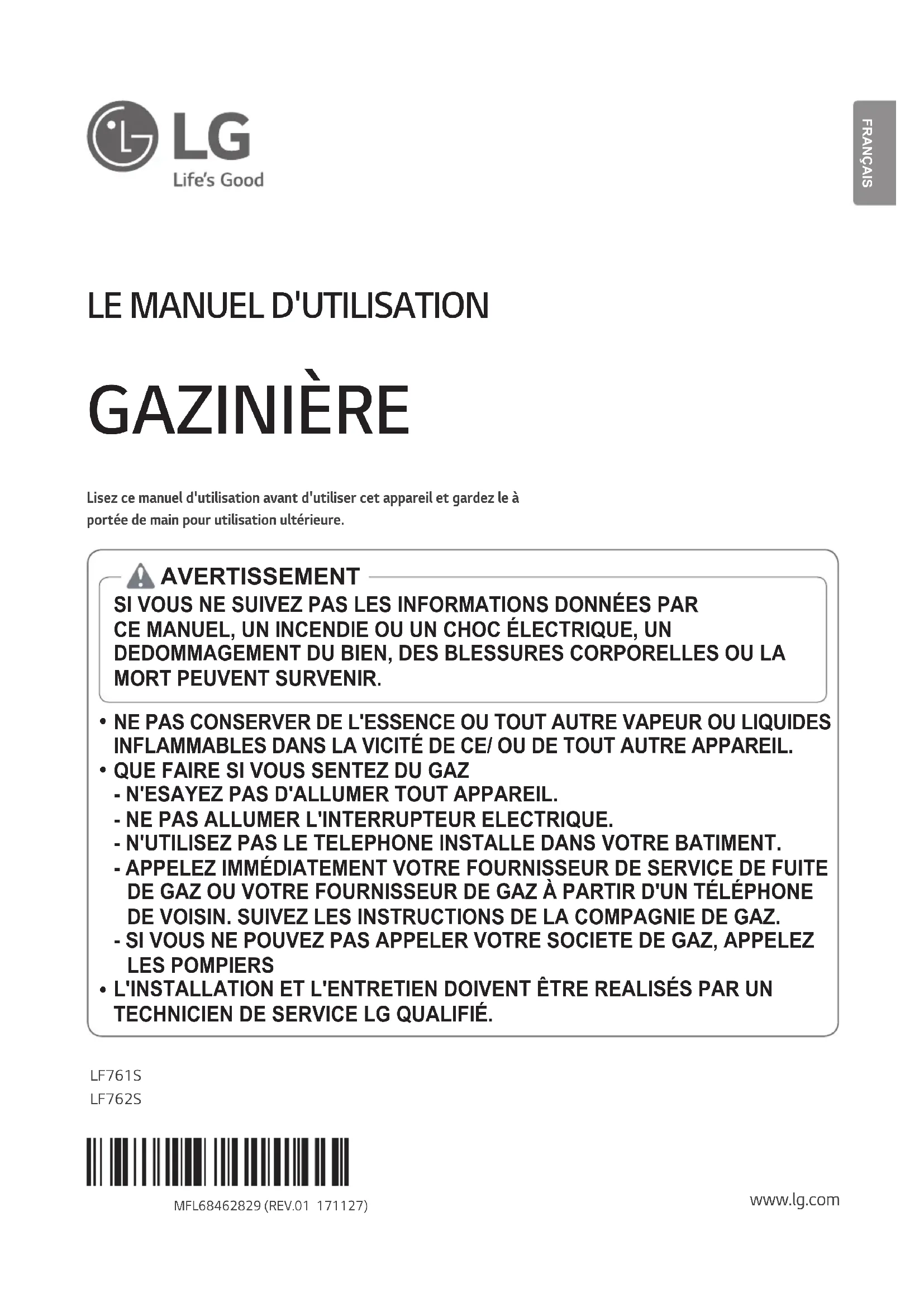 GAZINIÈRE Lisez ce manuel d'utilisation avant d'utiliser cet appareil et gardez le à portée de main pour utilisation ultérieure.