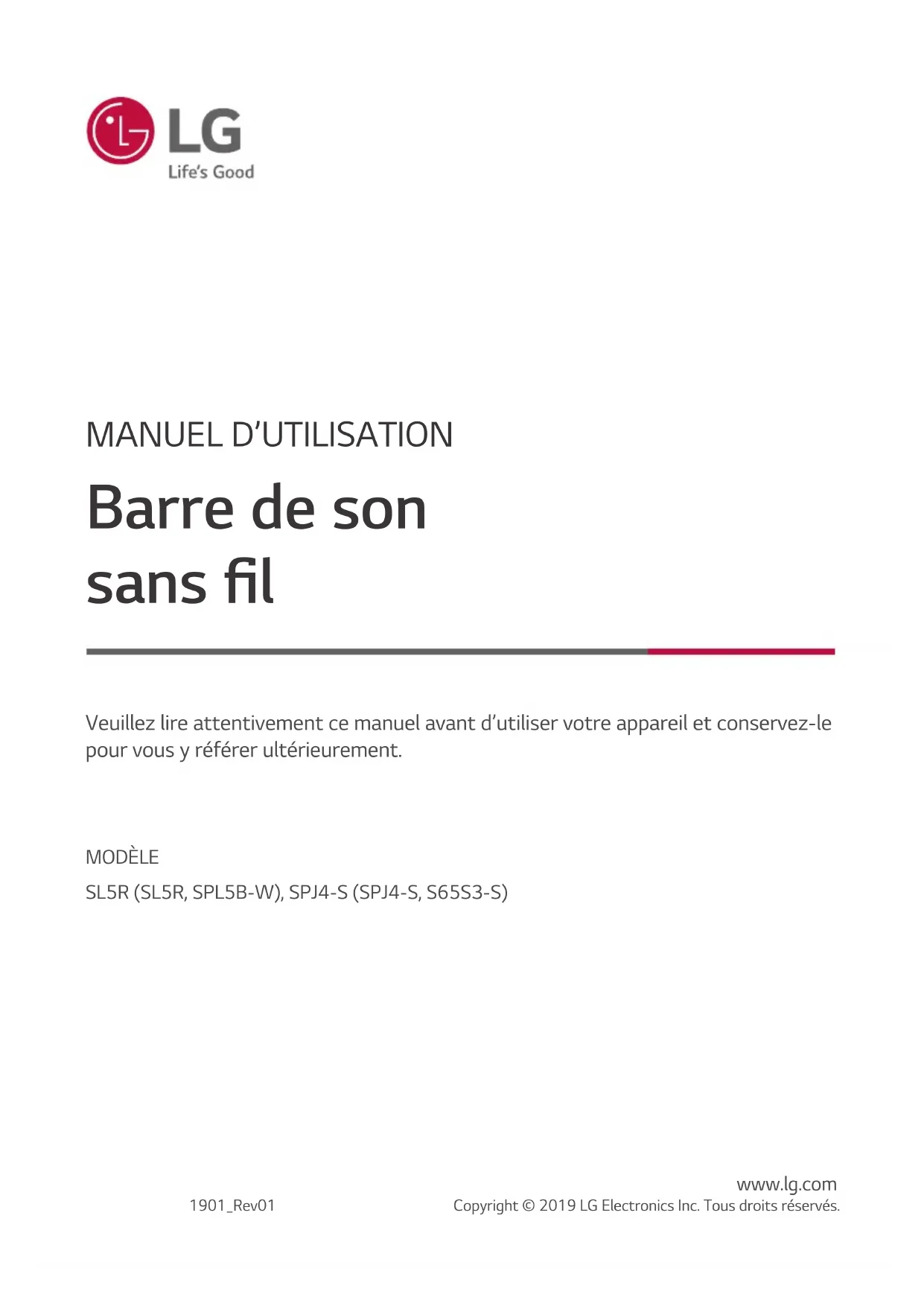Barre de son sans l Veuillez lire attentivement ce manuel avant d’utiliser votre appareil et conservez-le pour vous y référer ultérieurement. MODÈLE SL5R (SL5R, SPL5B-W), SPJ4-S (SPJ4-S, S65S3-S) 1901_Rev01 www.lg.com Copyright © 2019 LG Electronics Inc. Tous droits réservés.1 Démarrage Démarrage2 Démarrage