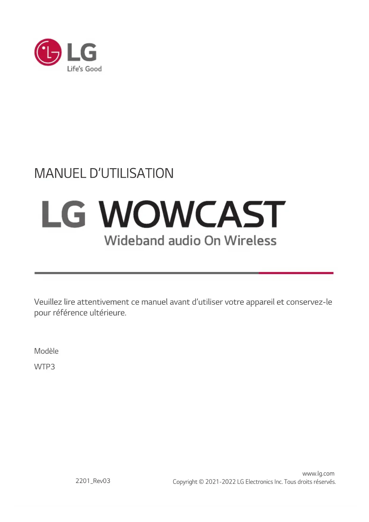 Veuillez lire attentivement ce manuel avant d’utiliser votre appareil et conservez-le pour référence ultérieure. Modèle WTP3 2201_Rev03 www.lg.com Copyright © 2021-2022 LG Electronics Inc. Tous droits réservés.2 Guide rapide LG WOWCAST Installation et utilisation du produit a Connectez le LG WOWCAST à votre téléviseur via un câble HDMI. TV (e)ARC HDMI IN (eARC/ARC) USB HDMI IN a b