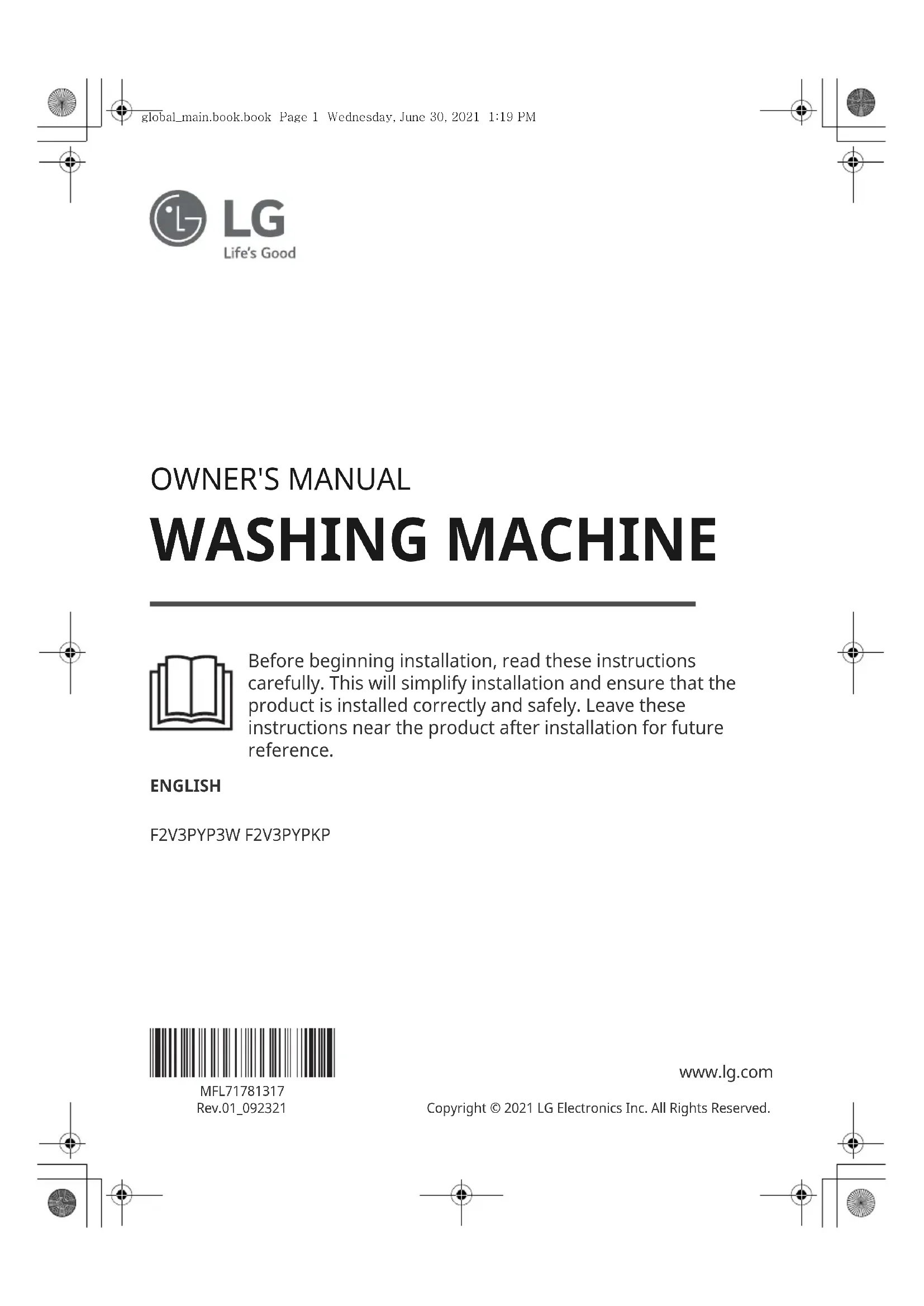 - Retire e limpe o dispensador de detergente, especialmente a parte superior e inferior da abertura do mesmo. pt_main.book.book Page 44 Wednesday, June 30, 2021 1:22 PMMANUEL DU PROPRIÉTAIRE LAVE-LINGE Avant de commencer l’installation, lire attentivement ces instructions. Cela simplifiera l’installation et assurera que le produit soit installé correctement et en toute sécurité. Conserver ces instructions à proximité du produit après installation pour référence ultérieure. FRANÇAIS F2V3PYP3W F2V3PYPKP www.lg.com Copyright © 2021 LG Electronics Inc. Tous droits réservés fr_main.book.book Page 1 Wednesday, June 30, 2021 1:20 PMTABLE DES MATIÈRES Ce manuel peut contenir des images ou un contenu différent du modèle que vous avez acheté. Ce manuel est sujet à révision par le fabricant.