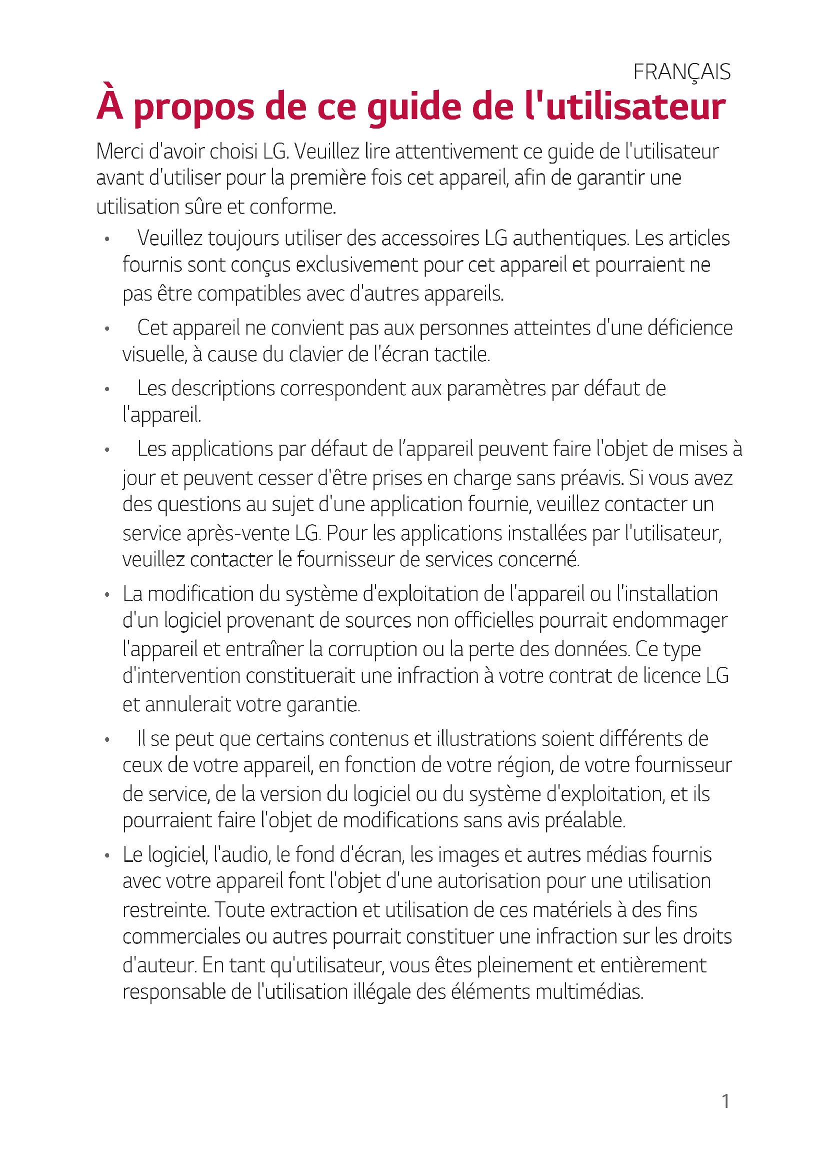 To obtain warranty service, please call the following telephone number from anywhere in Canada: LG Electronics Canada, Inc. Tel. 1-888-LG-Canada (1-888-542-2623) http://www.lg.com/ca_en (see links to “Support > Mobile phone support”) Electronics Canada Inc. North York, Ontario1 À propos de ce guide de l'utilisateur Merci d'avoir choisi LG. Veuillez lire attentivement ce guide de l'utilisateur avant d'utiliser pour la première fois cet appareil, afin de garantir une utilisation sûre et conforme. Ţ Veuillez toujours utiliser des accessoires LG authentiques. Les articles fournis sont conçus exclusivement pour cet appareil et pourraient ne pas être compatibles avec d'autres appareils. Ţ Cet appareil ne convient pas aux personnes atteintes d'une déficience visuelle, à c ause du clavier de l'écran tactile. Ţ Les descriptions correspondent aux paramètres par défaut de l'appareil. Ţ Les applications par défaut de l’appareil peuvent faire l'objet de mises à jour et peuvent cesser d'être prises en charge sans préavis. Si vous avez des questions au sujet d'une application fournie, veuillez contacter un service après-vente LG. Pour les applications installées par l'utilisateur, veuillez contacter le fournisseur de services concerné. Ţ La modification du système d'exploitation de l'appareil ou l'installation d'un logiciel provenant de sources non officielles pourrait endommager l'appareil et entraîner la corruption ou la perte des données. Ce type d'intervention constituerait une infraction à votre contrat de licence LG et annulerait votre garantie. Ţ Il se peut que certains contenus et illustrations soient différents de ceux de votre appareil, en fonction de votre région, de votre fournisseur de service, de la version du logiciel ou du système d'exploitation, et ils pourraient faire l'objet de modifications sans avis préalable. Ţ Le logiciel, l'audio, le fond d'écran, les images et autres médias fournis avec votre appareil font l'objet d'une autorisation pour une utilisation restreinte. Toute extraction et utilisation de ces matériels à des fins commerciales ou autres pourrait constituer une infraction sur les droits d'auteur. En tant qu'utilisateur, vous êtes pleinement et entièrement responsable de l'utilisation illégale des éléments multimédias. FRANÇAIS2 Ţ Des frais supplémentaires pourraient s'appliquer pour des services de données tels que la messagerie, le téléchargement, le téléversement, la synchronisation automatique et la localisation. Pour éviter des frais supplémentaires, sélectionnez un forfait de données adapté à vos besoins. Pour de plus amples renseignements, veuillez contacter votre fournisseur de services. Instructions
