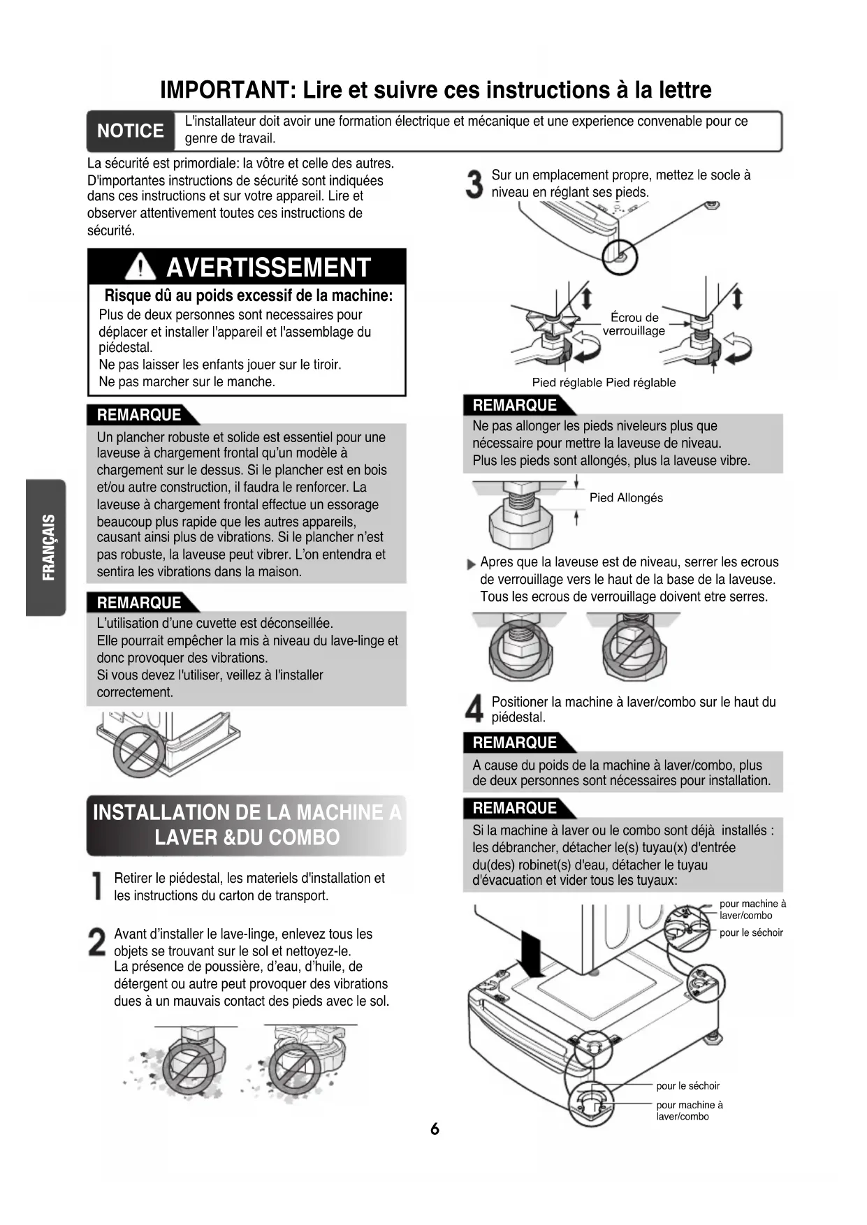 CUSTOMER INTER-ACTIVE CENTER NUMBERS: To Prove Warranty Coverage To Obtain Nearest Authorized Service Center or Sales Dealer, or to Obtain Product,Customer, or Service Assistance Retain your Sales Receipt to prove date of purchase. A copy of your Sales Receipt must be submitted at the time warranty service is provided. Call 1-800-243-0000 or 1-888-LGCANADA and choose the appropriate prompt from the menu, and have your product type, model number, serial number, and ZIP Code; or visit our website at http://www.lgservice.com WARRANTY6 FRANÇAISpour machine àlaver/combopour le séchoirpour le séchoirpour machine àlaver/comboÉcrou deverrouillagePied réglable Pied réglablePied Allongés IMPORTANT: Lire et suivre ces instructions à la lettre NOTICE L'installateur doit avoir une formation électrique et mécanique et une experience convenable pour cegenre de travail.La sécurité est primordiale: la vôtre et celle des autres.D'importantes instructions de sécurité sont indiquéesdans ces instructions et sur votre appareil. Lire etobserver attentivement toutes ces instructions desécurité.Retirer le piédestal, les materiels d'installation etles instructions du carton de transport.Positioner la machine à laver/combo sur le haut dupiédestal. AVERTISSEMENT Risque dû au poids excessif de la machine: Plus de deux personnes sont necessaires pourdéplacer et installer l'appareil et l'assemblage dupiédestal.Ne pas laisser les enfants jouer sur le tiroir.Ne pas marcher sur le manche.Un plancher robuste et solide est essentiel pour unelaveuse à chargement frontal qu’un modèle àchargement sur le dessus. Si le plancher est en boiset/ou autre construction, il faudra le renforcer. Lalaveuse à chargement frontal effectue un essoragebeaucoup plus rapide que les autres appareils,causant ainsi plus de vibrations. Si le plancher n’estpas robuste, la laveuse peut vibrer. L’on entendra etsentira les vibrations dans la maison.