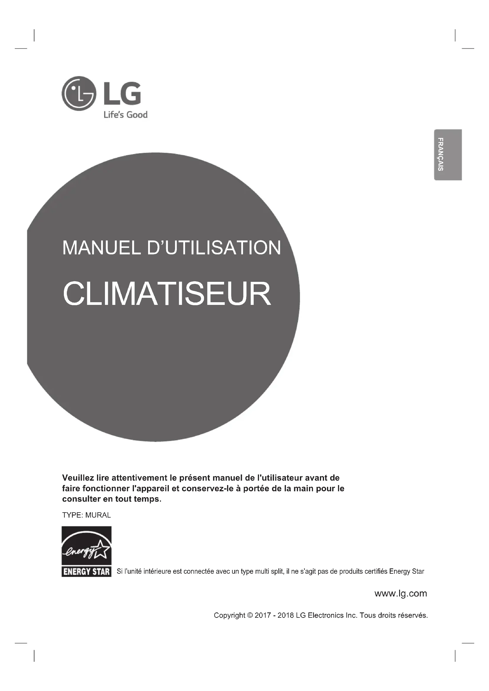 CLIMATISEUR Veuillez lire attentivement le présent manuel de l'utilisateur avant de faire fonctionner l'appareil et conservez-le à portée de la main pour le consulter en tout temps. TYPE: MURAL Si l’unité intérieure est connectée avec un type multi split, il ne s’agit pas de produits certifiés Energy Star www.lg.com Copyright © 2017 - 2018 LG Electronics Inc. Tous droits réservés.TABLE DES MATIÈRES