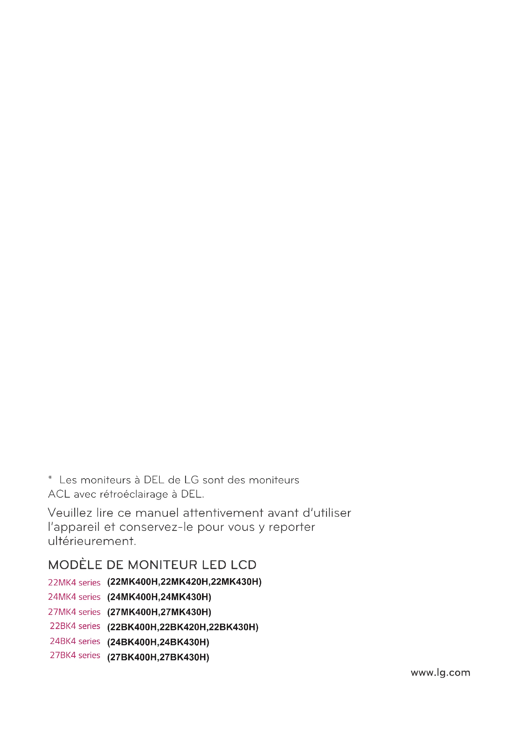 - Les moniteurs à DEL de LG sont des moniteurs ACL avec rétroéclairage à DEL. 22MK4 series 24MK4 series 27MK4 series 22BK4 series 24BK4 series 27BK4 series (22MK400H,22MK420H,22MK430H) (24MK400H,24MK430H) (27MK400H,27MK430H) (22BK400H,22BK420H,22BK430H) (24BK400H,24BK430H)