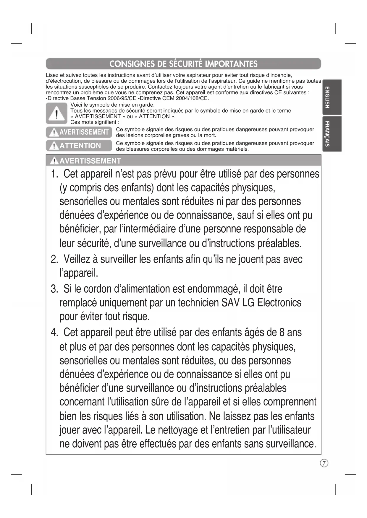 - Dispose the product right way. There is a risk of fire and explosion. CAUTION7 ENGLISH FRANÇAIS Lisez et suivez toutes les instructions avant d’utiliser votre aspirateur pour éviter tout risque d’incendie, d’électrocution, de blessure ou de dommages lors de l’utilisation de l’aspirateur. Ce guide ne mentionne pas toutes les situations susceptibles de se produire. Contactez toujours votre agent d’entretien ou le fabricant si vous rencontrez un problème que vous ne comprenez pas. Cet appareil est conforme aux directives CE suivantes : -Directive Basse Tension 2006/95/CE -Directive CEM 2004/108/CE.Voici le symbole de mise en garde.Tous les messages de sécurité seront indiqués par le symbole de mise en garde et le terme « AVERTISSEMENT » ou « ATTENTION ». Ces mots signifient :Ce symbole signale des risques ou des pratiques dangereuses pouvant provoquer des lésions corporelles graves ou la mort.Ce symbole signale des risques ou des pratiques dangereuses pouvant provoquer des blessures corporelles ou des dommages matériels.