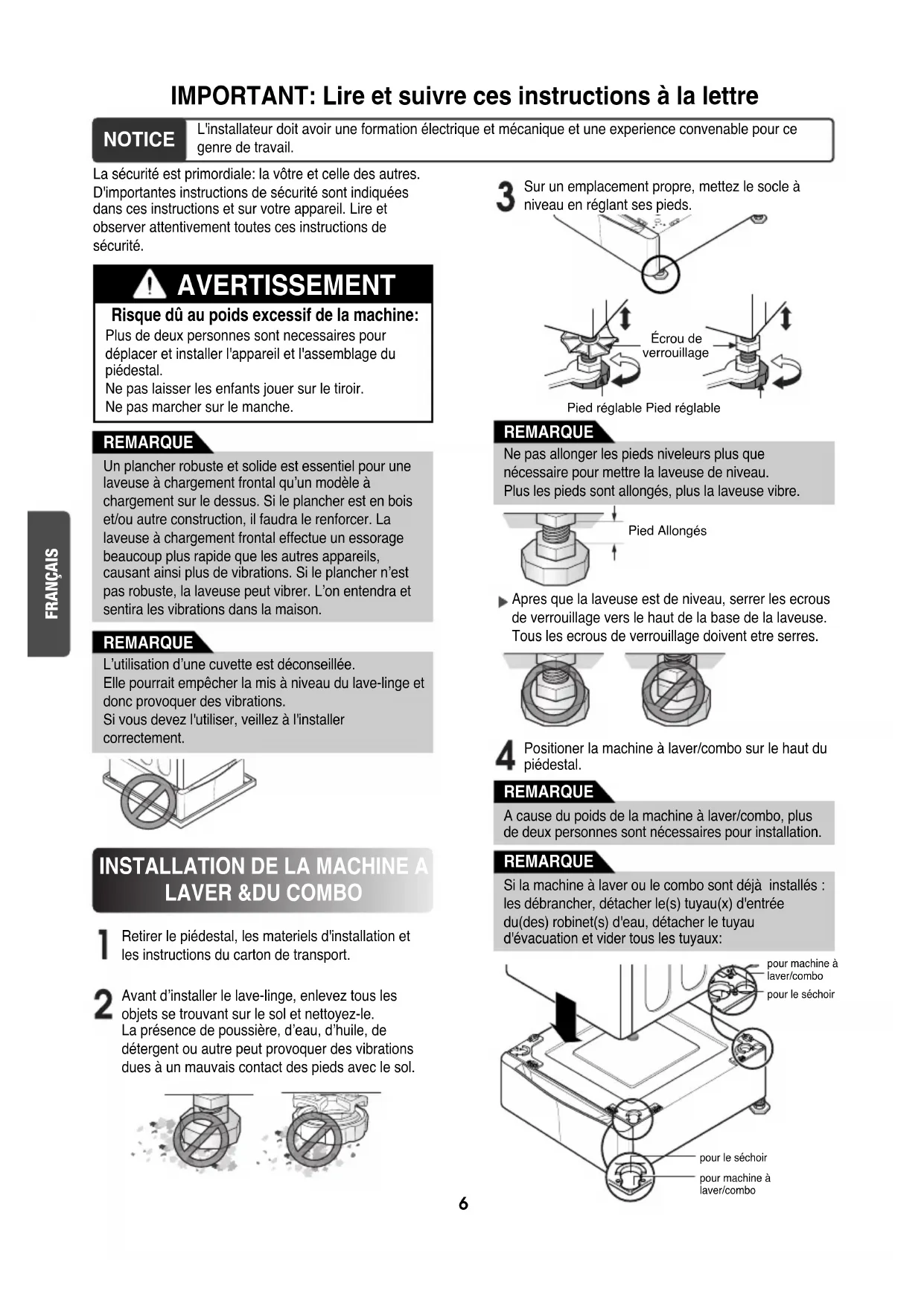 CUSTOMER INTER-ACTIVE CENTER NUMBERS: To Prove Warranty Coverage To Obtain Nearest Authorized Service Center or Sales Dealer, or to Obtain Product,Customer, or Service Assistance Retain your Sales Receipt to prove date of purchase. A copy of your Sales Receipt must be submitted at the time warranty service is provided. Call 1-800-243-0000 or 1-888-LGCANADA and choose the appropriate prompt from the menu, and have your product type, model number, serial number, and ZIP Code; or visit our website at http://www.lgservice.com WARRANTY6 FRANÇAISpour machine àlaver/combopour le séchoirpour le séchoirpour machine àlaver/comboÉcrou deverrouillagePied réglable Pied réglablePied Allongés IMPORTANT: Lire et suivre ces instructions à la lettre NOTICE L'installateur doit avoir une formation électrique et mécanique et une experience convenable pour cegenre de travail.La sécurité est primordiale: la vôtre et celle des autres.D'importantes instructions de sécurité sont indiquéesdans ces instructions et sur votre appareil. Lire etobserver attentivement toutes ces instructions desécurité.Retirer le piédestal, les materiels d'installation etles instructions du carton de transport.Positioner la machine à laver/combo sur le haut dupiédestal. AVERTISSEMENT Risque dû au poids excessif de la machine: Plus de deux personnes sont necessaires pourdéplacer et installer l'appareil et l'assemblage dupiédestal.Ne pas laisser les enfants jouer sur le tiroir.Ne pas marcher sur le manche.Un plancher robuste et solide est essentiel pour unelaveuse à chargement frontal qu’un modèle àchargement sur le dessus. Si le plancher est en boiset/ou autre construction, il faudra le renforcer. Lalaveuse à chargement frontal effectue un essoragebeaucoup plus rapide que les autres appareils,causant ainsi plus de vibrations. Si le plancher n’estpas robuste, la laveuse peut vibrer. L’on entendra etsentira les vibrations dans la maison.