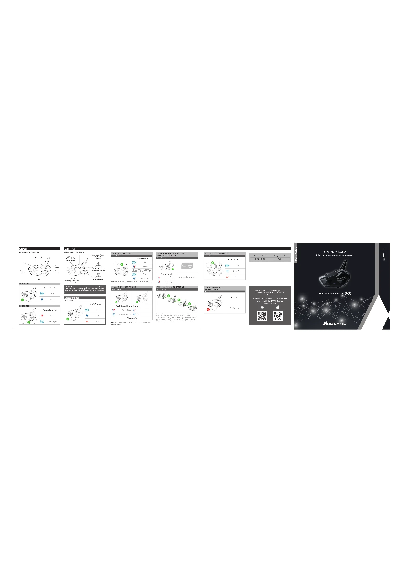 Appuyer pendant 7 secondesSuivre la procédure d’appairage avec le téléphoneClignote rapidement (maintenir enfoncé)Clignote lentement (relâcher)RÉINITIALISATION DES APPAIRAGES BLUETOOTHÉtat: Configurations Appuyer simultanément, 3 secondes Bip Validation (1 s) Fixe QUITTER LE MODE CONFIGURATIONSINTERROMPRE L’APPAIRAGEÉtat: Configurations Appuyer 2 foisLe clignotement change ATTENTION: Pour eectuer n’importe quel appairage il faut entrer dans Configurations. Si l’on appuie sur la touche Contrôle pendant moins de 7secondes, l’appareil s’allume au lieu d’entrer dans Configurations. Dans ce cas, répéter l’opération. Allez sur le site midlandeurope.com, téléchargez le manuel complet et le logiciel BT Updater. Personnalisez votre interphone et découvrez toutes les fonctions avec BTPRO SetApp. Téléchargez-la ici: FRANÇAIS