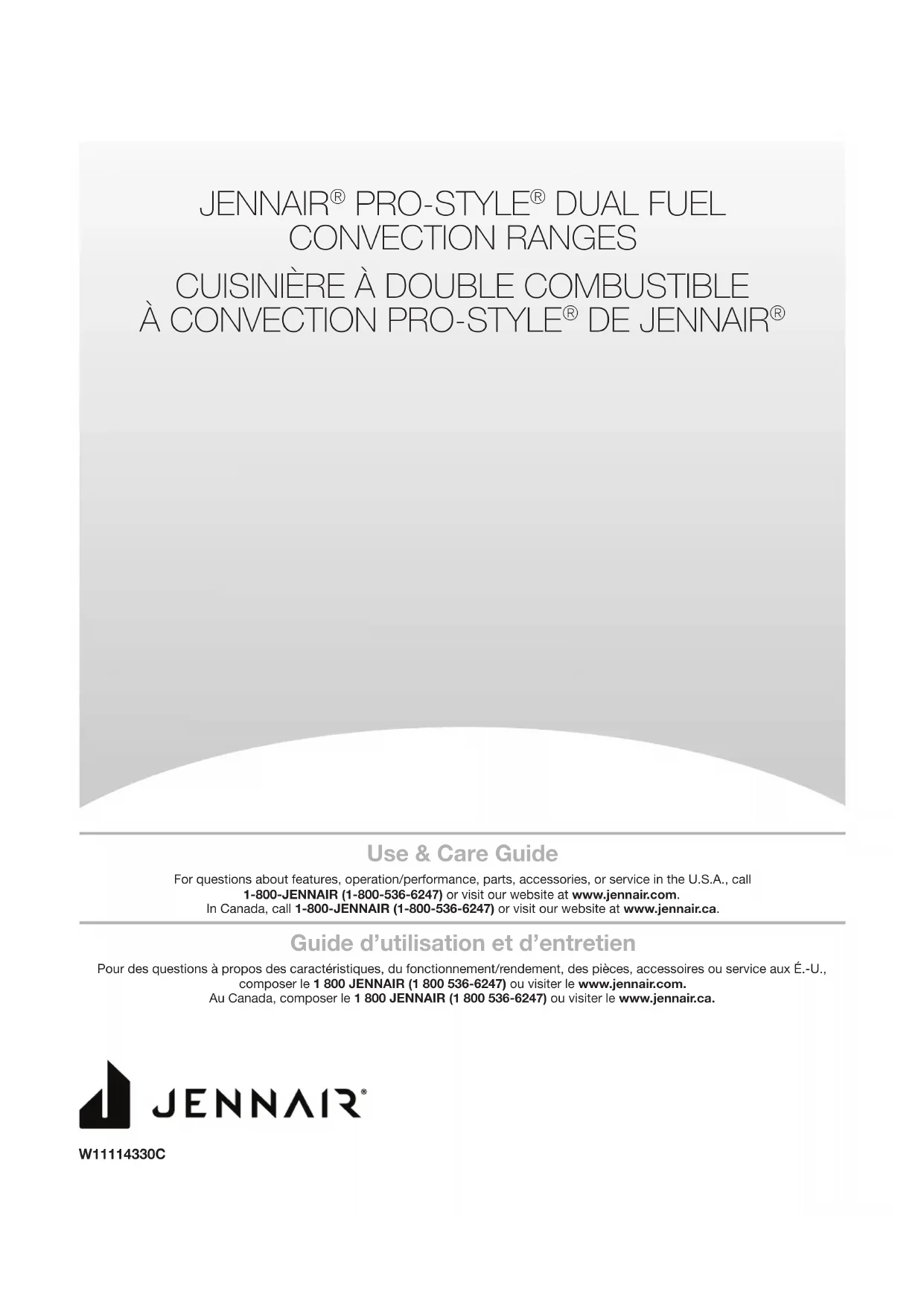 Rien ne fonctionne. Un fusible est grillé ou un disjoncteur est déclenché. Remplacer le fusible ou réenclencher le disjoncteur. Si le problème persiste, appeler un électricien. Les brûleurs de surface ne fonctionnent pas. C’est la première fois que les brûleurs de surface sont utilisés. Allumer n’importe quel brûleur de surface pour libérer l’air des canalisations de gaz. Le bouton de commande n’est pas réglé correctement. Enfoncer le bouton avant de le tourner à un réglage. Les orices du brûleur sont obstrués. Nettoyer les orices de brûleur obstrués avec une épingle droite. Les ammes des brûleurs de surface ne sont pas uniformes, sont de teinte jaune ou sont bruyantes. Les orices du brûleur sont obstrués. Nettoyer les orices de brûleur obstrués avec une épingle droite. Les chapeaux de brûleurs ne sont pas bien positionnés. S’assurer que le chapeau est bien aligné avec le brûleur. Du gaz propane est utilisé. La cuisinière a peut-être été mal convertie. Contacter un technicien de réparation qualié. Le brûleur de surface émet des bruits d’éclatement. Le brûleur est mouillé. Laisser sécher. Le brûleur émet des étincelles, mais ne s’allume pas. Il y a production continue d’étincelles sans que le brûleurs’allume. S’assurer que le chapeau est bien aligné avec le brûleur. Si les étincelles continuent, cesser l’utilisation du brûleur de surface et contacter un technicien de service. Chaleur excessive autour des ustensiles de cuisson sur la table de cuisson. Les ustensiles de cuisson n’ont pas la bonne taille. Utiliser un ustensile de cuisson à peu près de la même dimension que la surface de cuisson ou le brûleur de surface. L’ustensile de cuisson ne doit pas dépasser de plus de 1/2 po (1,3cm) hors de la zone de cuisson. La cuisson ne produit pas les résultats escomptés. Le bon ustensile de cuisson n’est pas utilisé. Utiliser des ustensiles de cuisson d’un poids moyen à lourd fabriqués de matériaux conçus pour le type de cuisson désiré. Les meilleurs ustensiles de cuisson doivent avoir un fond plat, des parois droites et un couvercle qui ferme hermétiquement. Le bouton de commande est réglé au niveau approprié de chaleur. Régler les commandes de cuisson à ÉLEVÉ, MOYEN ou FAIBLE selon le type de cuisson désiré. La cuisinière n’est pas d’aplomb. La cuisinière doit être d’aplomb pour que la plaque à frire puisse fonctionner correctement. Voir les Instructions d’installation pour des instructions de nivellement. Le four ne fonctionne pas. Le module de commande électronique du four est correctement réglé. S’assurer d’avoir suivi correctement les instructions de fonctionnement de la fonction à utiliser. Une mise en marche différée a été réglée à partir de l’application. Le four ne fonctionnera qu’à la n de la minuterie. Sur certains modèles, le mode Sabbat est activé. Ce mode permet de fonctionner en respectant le Sabbat juif. Voir la section du mode Sabbat pour le désactiver. Le ventilateur de refroidissement fonctionne durant la cuisson au four, la cuisson au gril ou le nettoyage. Il est normal que le ventilateur fonctionne automatiquement pendant l’utilisation du four et pendant un certain temps après l’arrêt du four pour refroidir le module de commande électronique. Essayez d’abord les solutions suggérées ici. Pour obtenir de l’aide ou des conseils qui permettront peut-être d’éviter uneintervention de dépannage, consulter la “garantie”, ou visiter le site Web http://jennair.custhelp.com. Au Canada, visiter le site Internet http://www.jennair.ca. DÉPANNAGE72