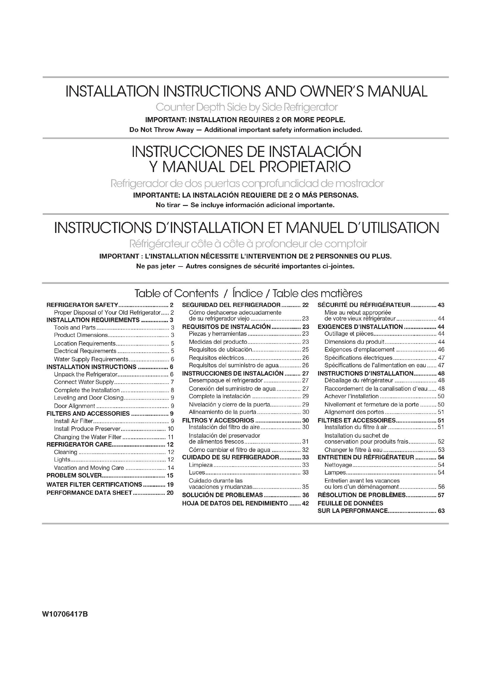 Outillage et pièces IMPORTANT : ■ Respecter toutes les prescriptions des codes et règlements en vigueur.■ Installateur : Remettre les instructions d’installation au propriétaire. ■ Propriétaire : Conserver les instructions d’installation pour consultation ultérieure et pour utilisation par l’inspecteur local des installations électriques.■ Garder la pièce de carton ou de contreplaqué d’expédition sous le réfrigérateur jusqu’à son installation à l’emplacement de service. ■ Observer les spécifications et dimensions d’installation. ■ Retirer toute moulure ou tout panneau décoratif des meubles de cuisine qui entraveraient l’accès au réfrigérateur lors d’une intervention de réparation.■ Communiquer avec un électricien qualifié.OUTILLAGE REQUIS (sur certains modèles) : Rassembler les outils et pièces nécessaires avant de commencer l’installation. Lire et suivre les instructions fournies avec les outils indiqués ici.PIÈCES NÉCESSAIRES (sur certains modèles) : ■ Votre marchand de réfrigérateurs présente une trousse avec un robinet d’arrêt à étrier de ¹⁄₄" (6,35 mm), un raccord et un tube en cuivre. ■ Ou vous pouvez acheter un tube en cuivre de ¹⁄₄" (6,35 mm) avec un robinet d’arrêt et un raccord de compression de ¹⁄₄" (6,35 mm).■ Selon les raccordements de la canalisation d’eau, il vous faudra peut-être aussi un écrou de ¹⁄₄" (6,35 mm) et une virole de ¹⁄₄" (6,35 mm). Dimensions du produit Vue de dessus *Les dimensions peuvent varier en fonction du type de poignée de porte. La profondeur pour utilisation de la poignée la plus large est indiquée. AVERTISSEMENT Risque de suffoquer Enlever les portes de votre vieux réfrigérateur. Le non-respect de cette instruction peut causer un décès ou des lésions cérébrales. Renseignements importants à propos de la mise au rebut des fluides réfrigérants : Mettre le réfrigérateur au rebut conformément à la réglementation fédérale et locale. Les fluides réfrigérants doivent être évacués par un technicien certifié et agréé par l’EPA conformément aux procédures établies. ■ Perceuse sans fil■ Tour ne-écrou de ¹⁄₄" et foret■ Tournevis à lame plate ■ Clé de ⁵⁄₁₆" ou clé à molette ■ Clés plates de ⁷⁄₁₆" et ¹⁄₂" ■ Deux clés à molette ■ Clés à douille de ³⁄₈" et ¹⁄₂" Style de porteProfondeur Profondeur Profondeur Plate 27¹⁄₂"(69,8 cm)2⁵⁄₈"(6,5cm) maximale*30" (76,3 cm) maximale*Incurvée 28⁵⁄₈"(72,5 cm)2⁵⁄₈"(6,5 cm)31¹⁄₈"(79,1 cm)