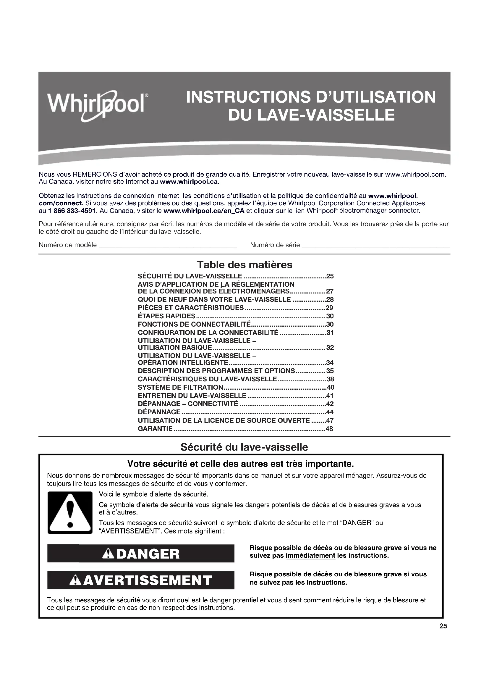 DU LAVE-VAISSELLE Sécurité du lave-vaisselle Table des matières Nous vous REMERCIONS d’avoir acheté ce produit de grande qualité. Enregistrer votre nouveau lave-vaisselle sur www.whirlpool.com. Au Canada, visiter notre site Internet au www.whirlpool.ca. Obtenez les instructions de connexion Internet, les conditions d’utilisation et la politique de condentialité au www.whirlpool. com/connect. Si vous avez des problèmes ou des questions, appelez l’équipe de Whirlpool Corporation Connected Appliances au1866333-4591. Au Canada, visiter le www.whirlpool.ca/en_CA et cliquer sur le lien Whirlpool