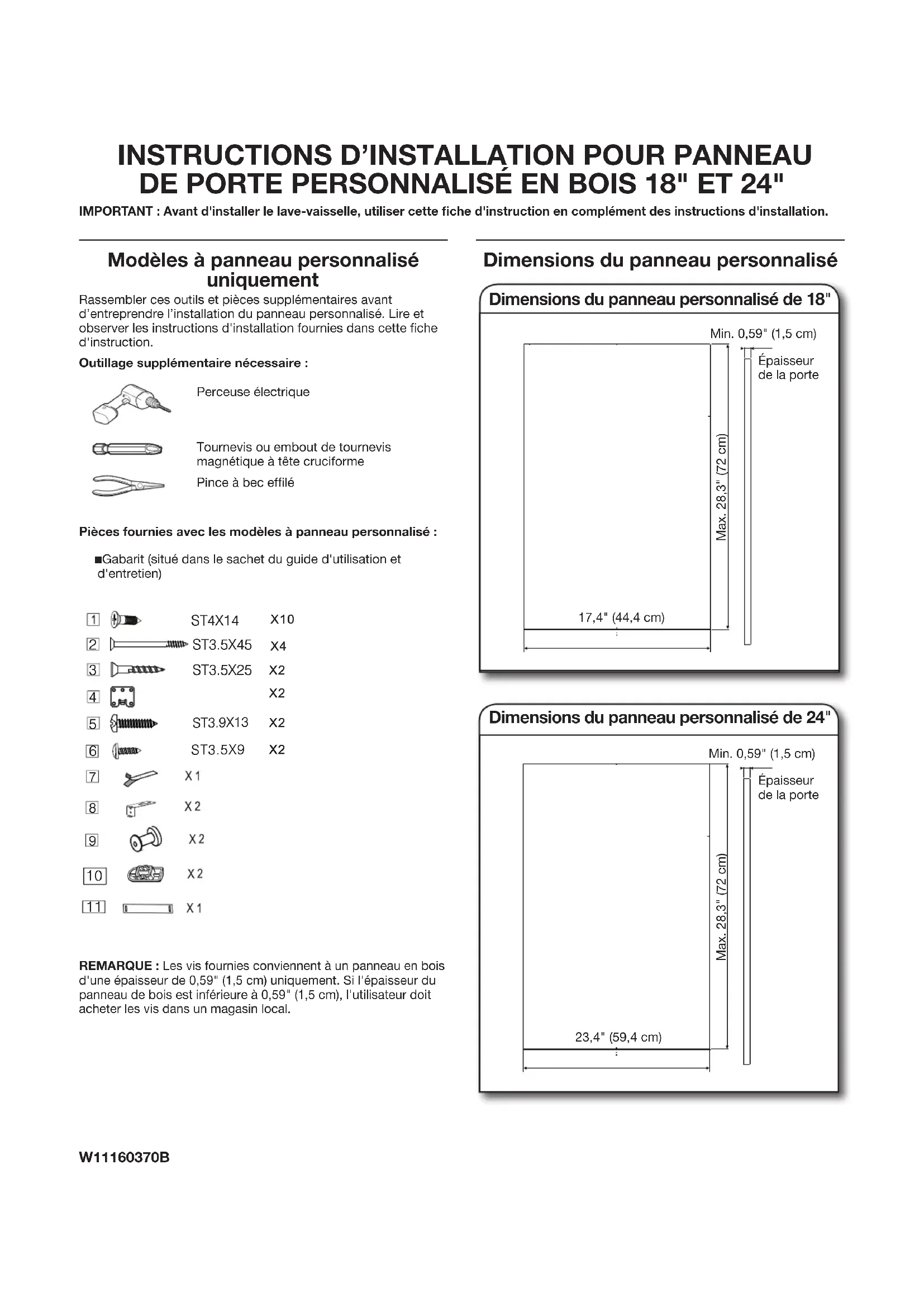 IMPORTANT: Avant d'installer le lave-vaisselle, utiliser cette che d'instruction en complément des instructions d'installation. Modèles à panneau personnalisé uniquement Rassembler ces outils et pièces supplémentaires avant d’entreprendre l’installation du panneau personnalisé. Lire et observer les instructions d'installation fournies dans cetteche d'instruction.Outillage supplémentaire nécessaire :Perceuse électriqueTournevis ou embout de tournevis magnétique à tête cruciformePince à bec efléPièces fournies avec les modèles à panneau personnalisé : ■ Gabarit (situé dans le sachet du guide d'utilisation etd'entretien)REMARQUE: Les vis fournies conviennent à un panneau en bois d'une épaisseur de 0,59" (1,5 cm) uniquement. Sil'épaisseur du panneau de bois est inférieure à 0,59" (1,5 cm), l'utilisateur doit acheter les vis dans un magasin local. Dimensions du panneau personnalisé Max. 28,3" (72 cm) 17,4" (44,4 cm)Min. 0,59" (1,5 cm)Épaisseur de la porte Dimensions du panneau personnalisé de 18" Max. 28,3" (72 cm) Min. 0,59" (1,5 cm)Épaisseur de la porte Dimensions du panneau personnalisé de 24" ST3.5X25