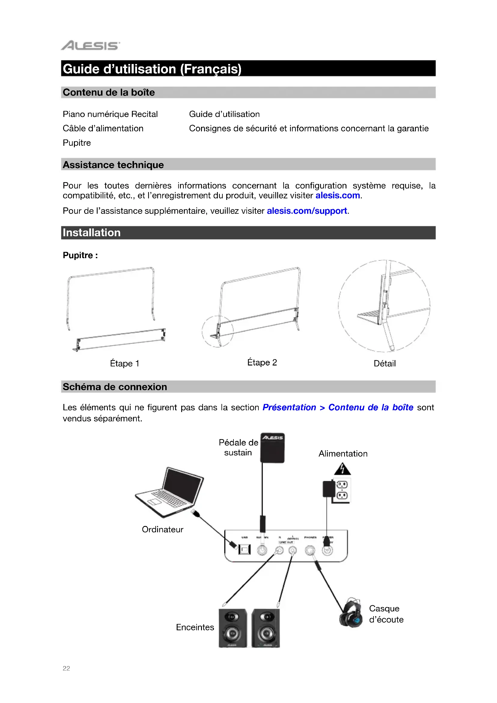 Advanced Function. Réinitialisation des paramètres par défaut Pour réinitialiser les paramètres par défaut du Recital, il suffit de maintenir les touches Reverb et Chorus enfoncées lors de sa mise sous tension. Les paramètres suivants seront réinitialisés à leurs valeurs par défaut : Reverb, Chorus, Metronome Tempo, Metronome Time Signature, Metronome Volume, Upper Volume, Lower Volume, Split Volume, Split Point, MIDI Channel, Touch Sensitivity et Auto Power Off.32 Dépannage Problème Cause et solution possibles Les haut-parleurs produisent un fort bruit lorsque le piano est mis sous et hors tension. Veuillez ne pas vous inquiéter, ceci est tout à fait normal. Les haut-parleurs ne produisent pas de son lorsque les touches sont jouées. Veuillez vérifier que le volume principal n’est pas trop faible ou si un casque d’écoute est branché à la sortie casque. Les haut-parleurs sont mis en sourdine lorsqu'un casque d’écoute est branché à la sortie casque. Les haut-parleurs produisent des bruits parasitaires ou de l'interférence. L'utilisation d'un téléphone mobile à proximité du Recital peut produire de l’interférence. Si tel est le cas, fermez ou éloignez le téléphone mobile du piano. Certaines notes produisent la mauvaise tonalité. Veuillez vous assurer que la valeur de transposition est 0. Si cela ne fonctionne pas, maintenez les touches Reverb et Chorus enfoncées lors de la mise sous tension afin de réinitialiser les paramètres par défaut du Recital. Le son des notes est faible ou déformé. Si le clavier est alimenté par piles, veuillez vous assurer d’installer de nouvelles piles.33 Guida per l'uso (Italiano) Contenuti della confezione Pianoforte digitale Recital Adattatore di alimentazione Leggio Guida per l'uso Istruzioni di sicurezza e garanzia Assistenza Per le ultime informazioni in merito a questo prodotto (requisiti di sistema, informazioni sulla compatibilità, ecc.) e per la registrazione del prodotto, recarsi alla pagina alesis.com. Per ulteriore assistenza sul prodotto, recarsi alla pagina alesis.com/support. Configurazione Leggio: