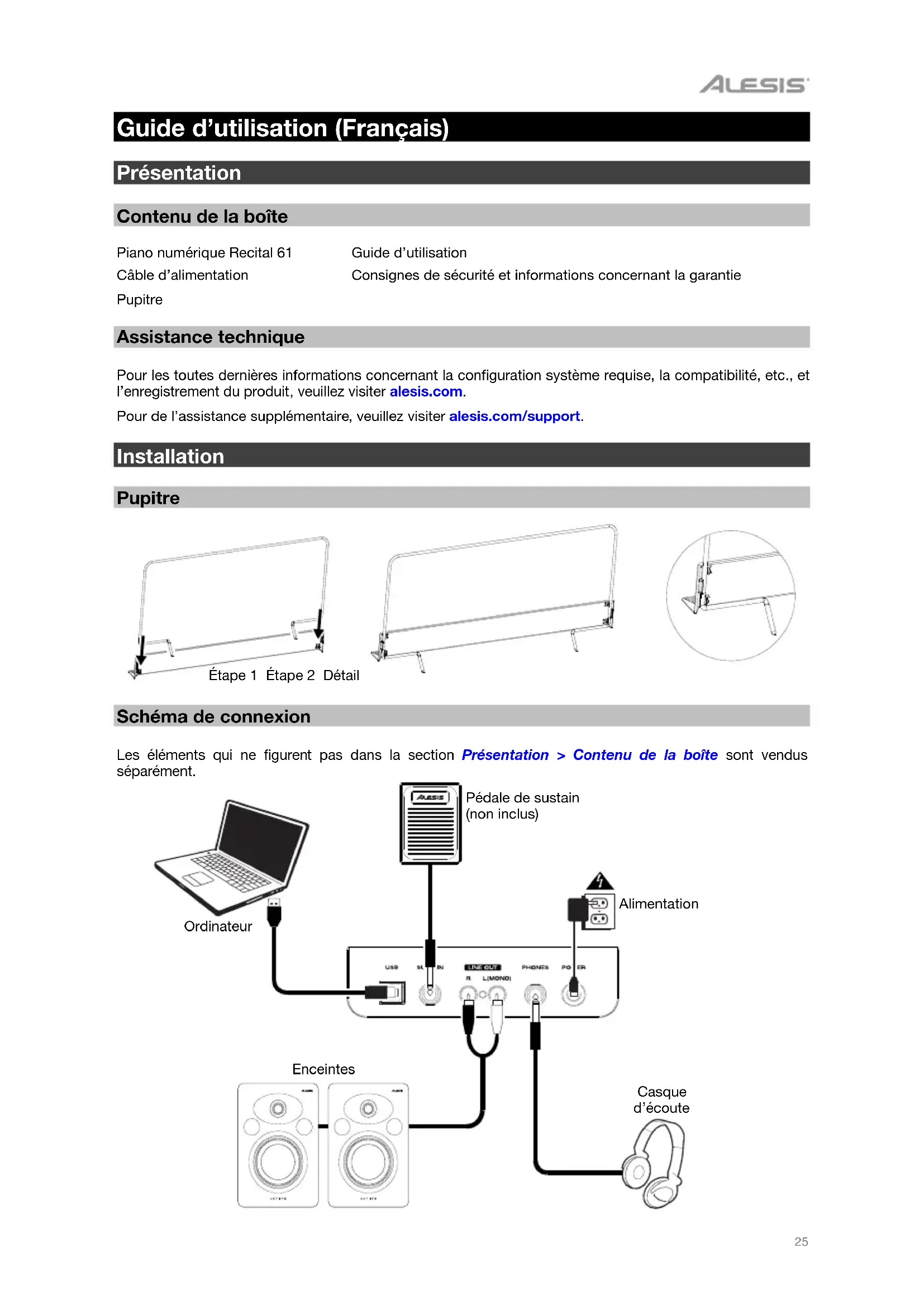 Assistance technique Pour les toutes dernières informations concernant la configuration système requise, la compatibilité, etc., et l’enregistrement du produit, veuillez visiter alesis.com. Pour de l’assistance supplémentaire, veuillez visiter alesis.com/support. Installation Pupitre