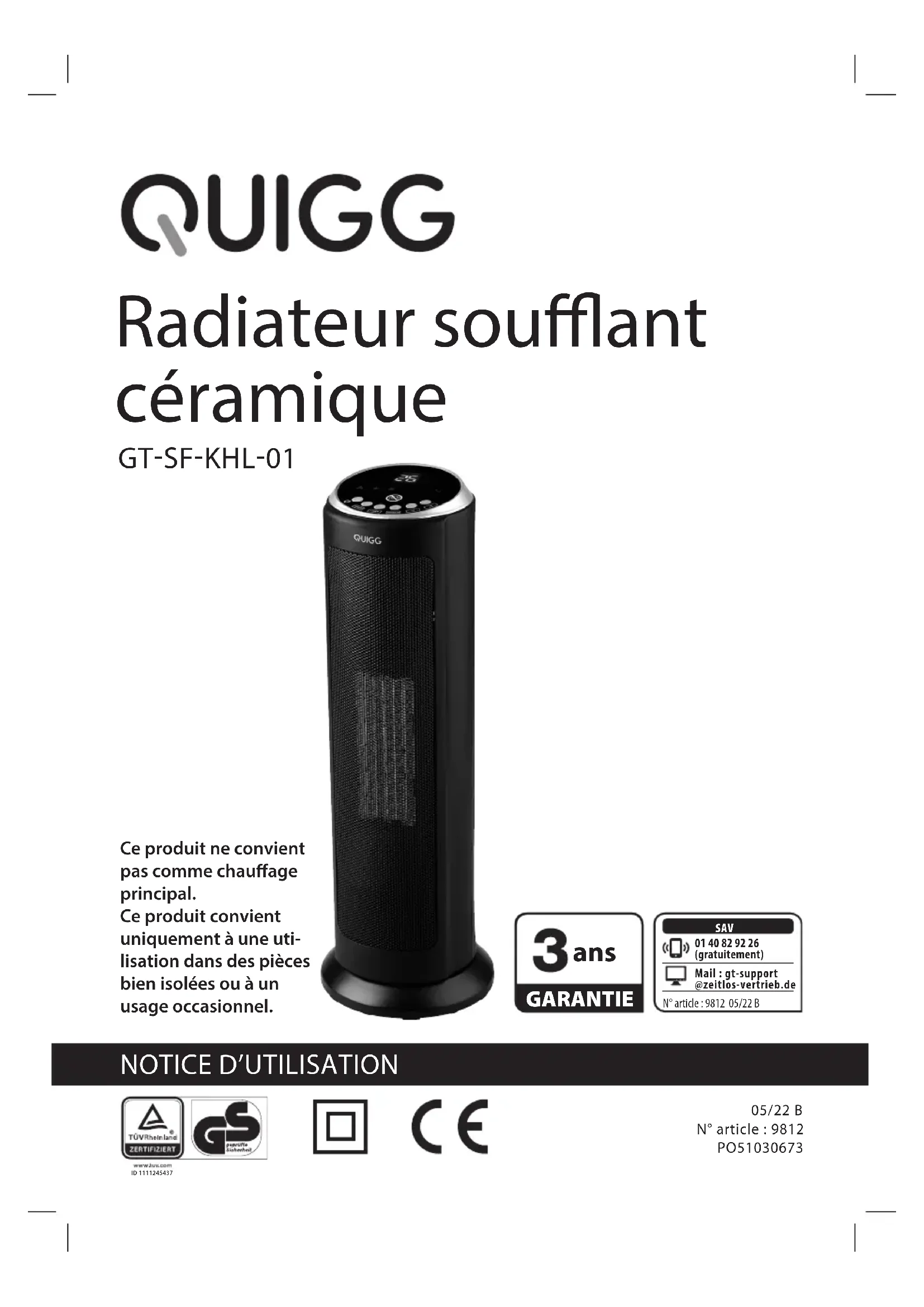 Introduction Nous vous remercions d’avoir choisi un radiateur souant céramique Quigg. Vous venez d’acquérir un produit de qualité qui satisfait aux normes de performance et de sécurité les plus éle- vées. An de manipuler correctement l’appareil et de garantir sa longévité, nous vous recommandons de respec- ter les indications suivantes. Veuillez lire attentivement cette notice d’utilisation et notamment les consignes de sécurité avant la mise en service de l’appareil. Vous y trouverez un certain nombre de recomman- dations importantes et utiles qui doivent être comprises et observées par tous les utilisateurs avant la mise en service. Conservez cette notice d’utilisation et donnez-la avec l’appa- reil si vous le remettez à une autre personne. Déclaration de conformité UE La déclaration de conformité UE est disponible auprès du constructeur/ importateur. Les produits portant le symbole CE satisfont aux exigences de toutes les directives CE en vigueur. L’appareil est conforme à la directive sur la sécurité des produits. Ceci est prouvé par le sigle GS de l’institut de contrôle indépendant: Utilisation conforme Le radiateur souant est exclu- sivement réservé au chau age et à l’aération de pièces sèches et fermées. De plus, l’appareil n’est pas destiné à une utilisation professionnelle mais uniquement à une utilisation domestique et privée. Il peut également être uti- lisé par les employés de magasins ou de bureaux, dans les proprié- tés agricoles, ou par les clients des hôtels, motels et autres types d’hébergement comme les chambres d’hôtes. Toute autre utilisation ou modi cation de l’appareil n’est pas conforme et est strictement interdite. Nous ne pouvons être tenus respon- sables des dommages survenus à la suite d’une utilisation non conforme ou incorrecte. Éditeur de la notice: Globaltronics GmbH & Co. KG Bei den Mühren 5 20457 Hamburg, Allemagne Généralités ID 11112454375