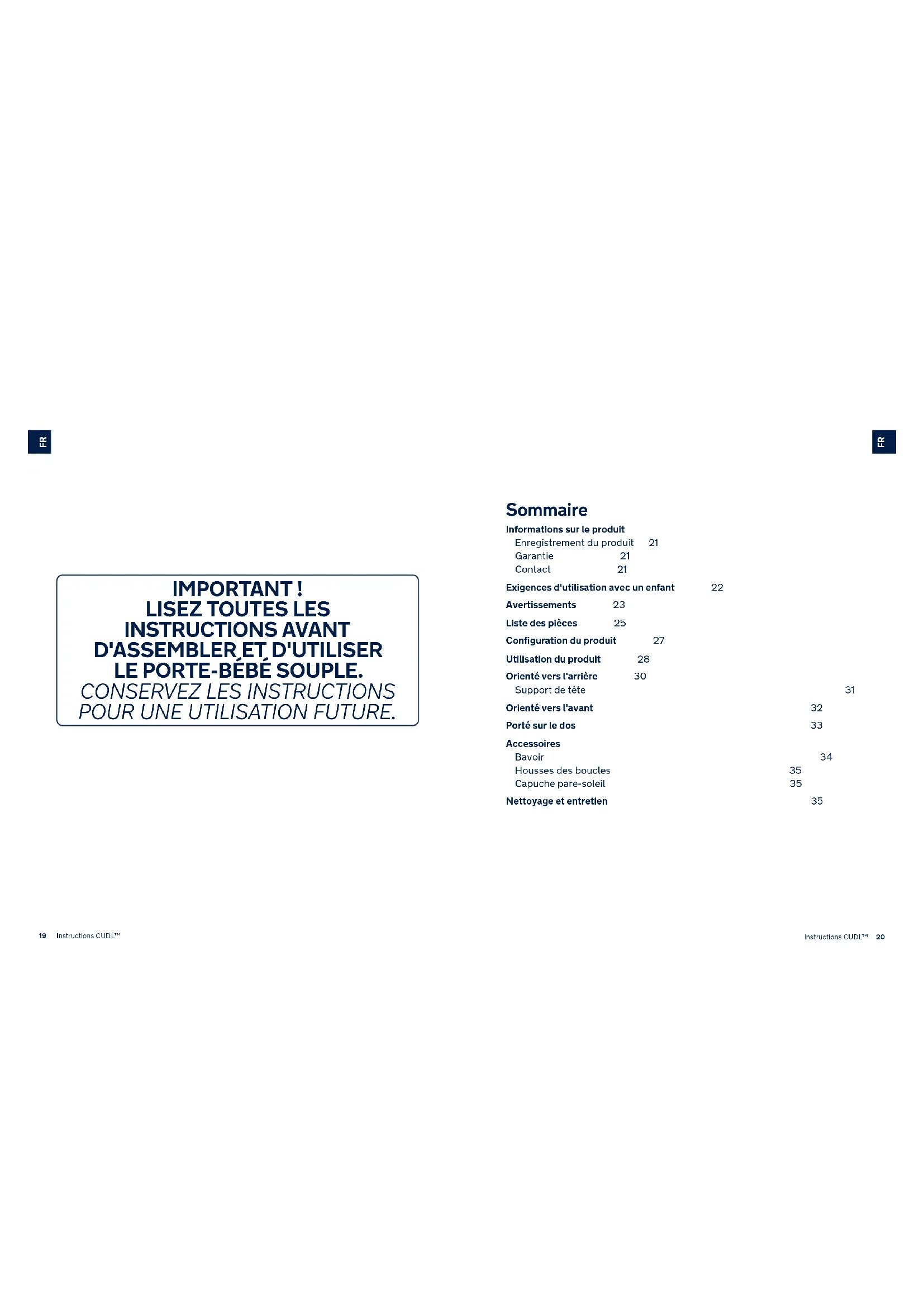 Sommaire Informations sur le produit Enregistrement du produit 21 Garantie 21 Contact 21 Exigences d'utilisation avec un enfant 22 Avertissements 23 Liste des pièces 25 Configuration du produit 27 Utilisation du produit 28 Orienté vers l'arrière 30 Support de tête 31 Orienté vers l'avant 32 Porté sur le dos 33 Accessoires Bavoir 34 Housses des boucles 35 Capuche pare-soleil 35 Nettoyage et entretien 35 19 Instructions CUDL™ 20Instructions CUDL™ IMPORTANT !