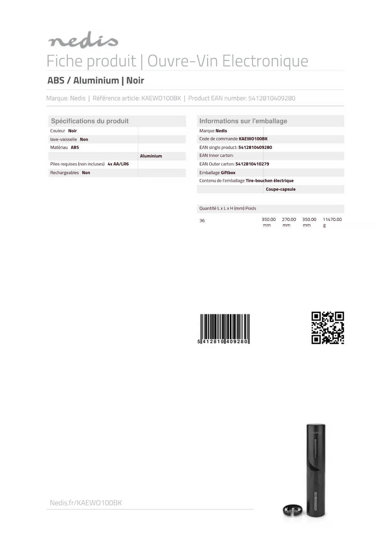 Nedis.fr/KAEWO100BK Fiche produit | Ouvre-Vin Electronique ABS / Aluminium | Noir Marque: Nedis | Référence article: KAEWO100BK | Product EAN number: 5412810409280 Spécifications du produit Couleur Noir lave-vaisselle Non Matériau ABS Aluminium Piles requises (non incluses) 4x AA/LR6 Rechargeables Non Informations sur l'emballage Marque Nedis Code de commande KAEWO100BK EAN single product: 5412810409280 EAN Inner carton: EAN Outer carton: 5412810410279 Emballage Giftbox Contenu de l'emballage Tire-bouchon électrique Coupe-capsule Quantité L x L x H (mm) Poids
