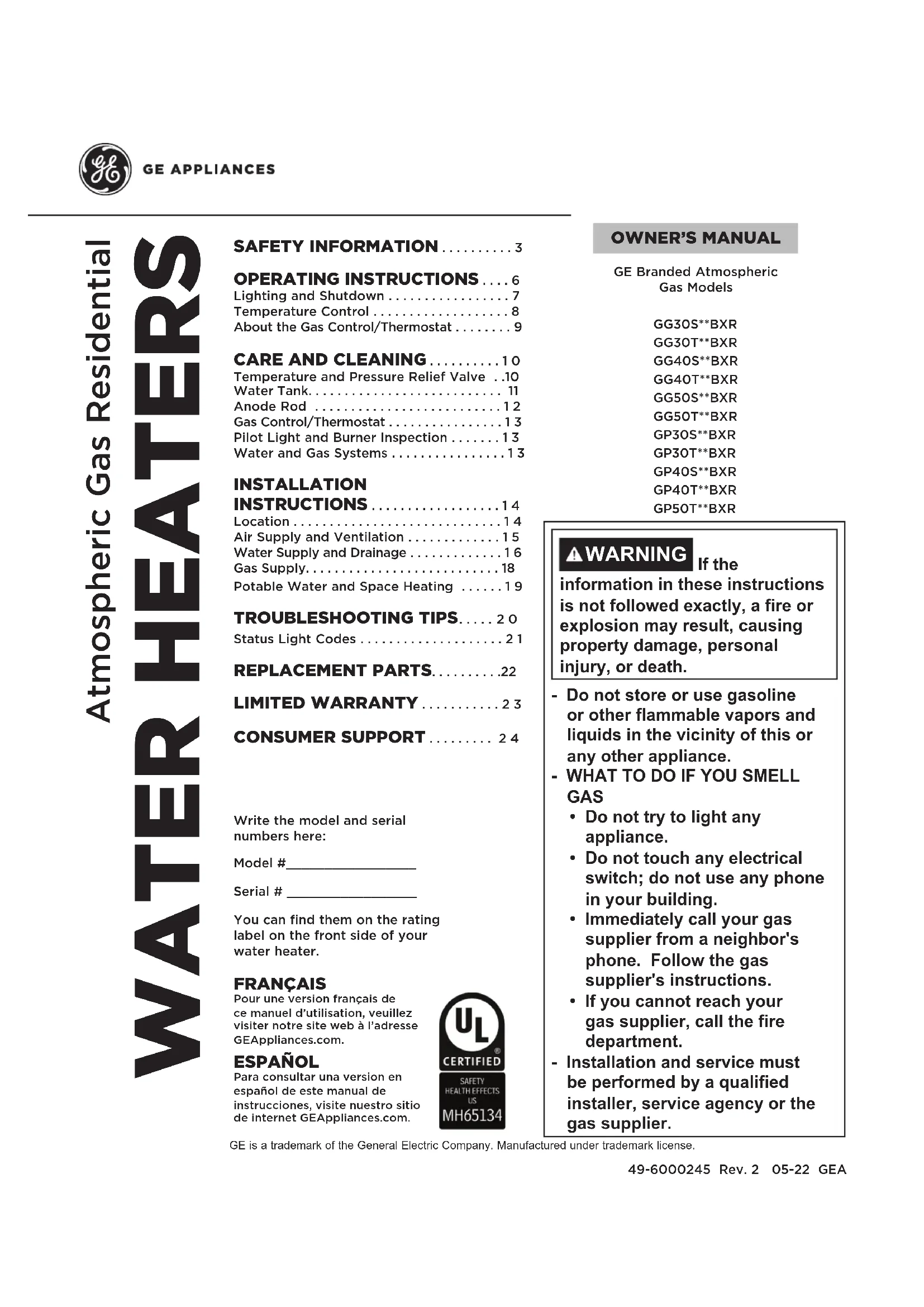 - Contactez votre installateur, votre plombier ou appelez le service et l’assistance GE Appliances au 1-800-943-8186. REMARQUE : Il se peut que le numéro de téléphone de votre installateur se trouve sur l’étiquette du produit. Si le problème persiste, contactez le soutien à la clientèle GEA sur GEAppliances.com/waterheater.EL MANUAL DEL PROPIETARIO Residenciales de Gas Atmosférico 49-6000245 Rev. 2 05-22 GEA Modelos de Gas Atmosférico de la Marca GE Appliances GG30S**BXRGG30T**BXRGG40S**BXRGG40T**BXRGG50S**BXRGG50T**BXRGP30S**BXRGP30T**BXRGP40S**BXRGP40T**BXRGP50T**BXR
