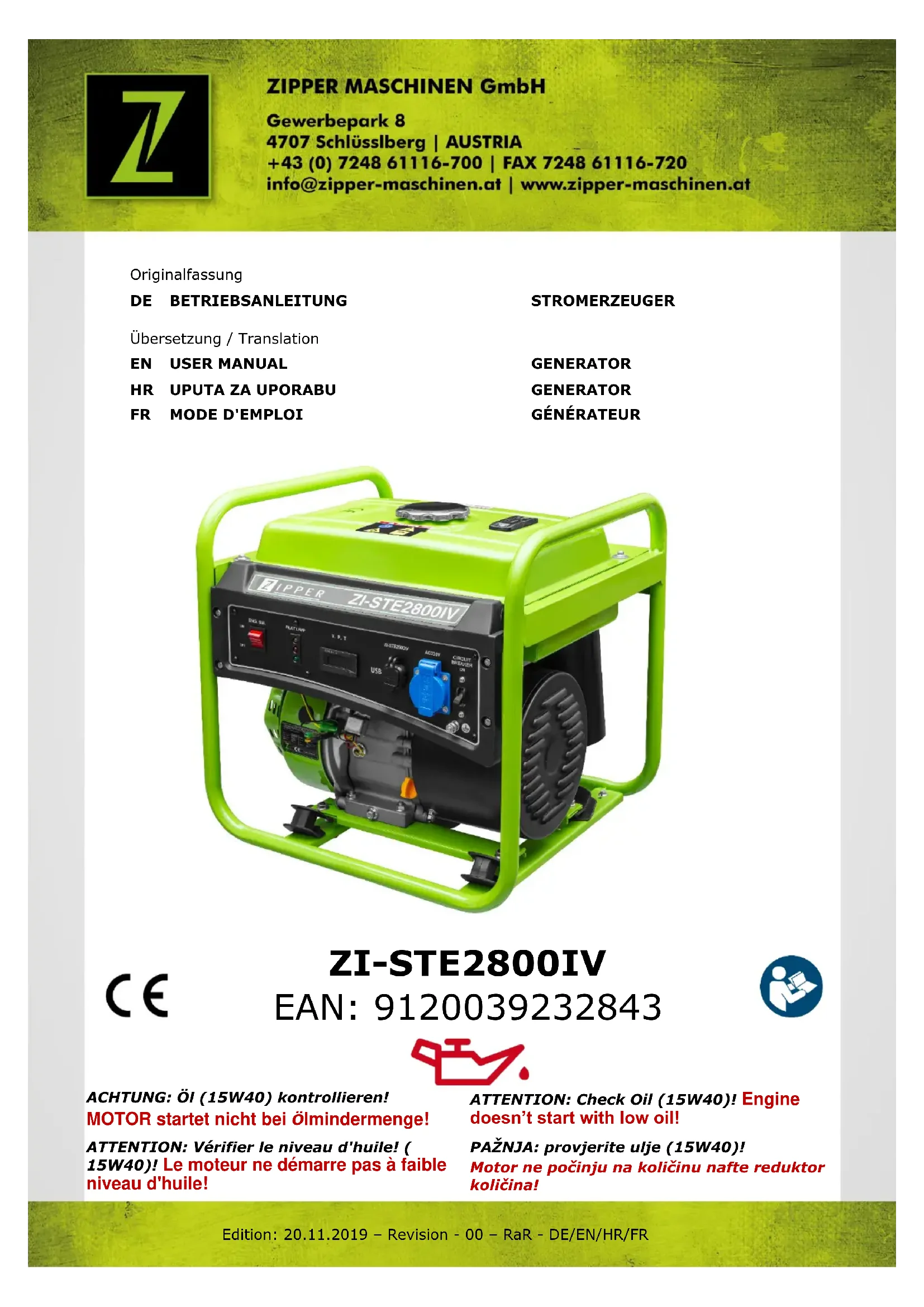 NAP OMENA Ako niste u stanju uredno provesti potrebne popravke ili nemate za to propisanu obuku, za uklanjanje problema uvijek potražite specijaliziranu radionicu.PREFACE (FR) ZIPPER MASCHINEN GmbH www.Zipper-Maschinen.at 36 ZI-STE2800IV 20 PREFACE (FR) Cher Client, Ce manuel contient des informations et des conseils pour une utilisation correcte et sûre et l'entretien du générateur ZI-STE2800IV. Le manuel fait partie de la machine et ne doit pas être stocké séparément. Le lire attentivement avant la première utilisation de la machine et le conserver pour référence future. Lorsque la machine est utilisée par d'autres personnes, toujours remettre le manuel avec la machine. Ci-après le nom commercial habituel de l'appareil (voir page de couverture) de ce manuel sera remplacé par le terme "machine". Lire et respecter les consignes de sécurité! Avant la première utilisation lire attentivement ce manuel. Cela facilite l'utilisation correcte de la machine et évite les dysfonctionnements et les dommages sur la machine et sur la santé de l'utilisateur. En raison des progrès constants dans la conception des produits les photos et le contenu peuvent varier légèrement. Cependant, si vous constatez des erreurs, merci de nous en informer. Les spécifications techniques sont soumises à changements! Droit d’auteur © 2017 Ce document est protégé par le droit international des droits d'auteur. Tous droits réservés. Surtout la réimpression et la traduction et la représentation des images seront poursuivies par la loi. Compétence de la Cour de Linz ou le tribunal compétent pour 4707 Schlüsslberg.