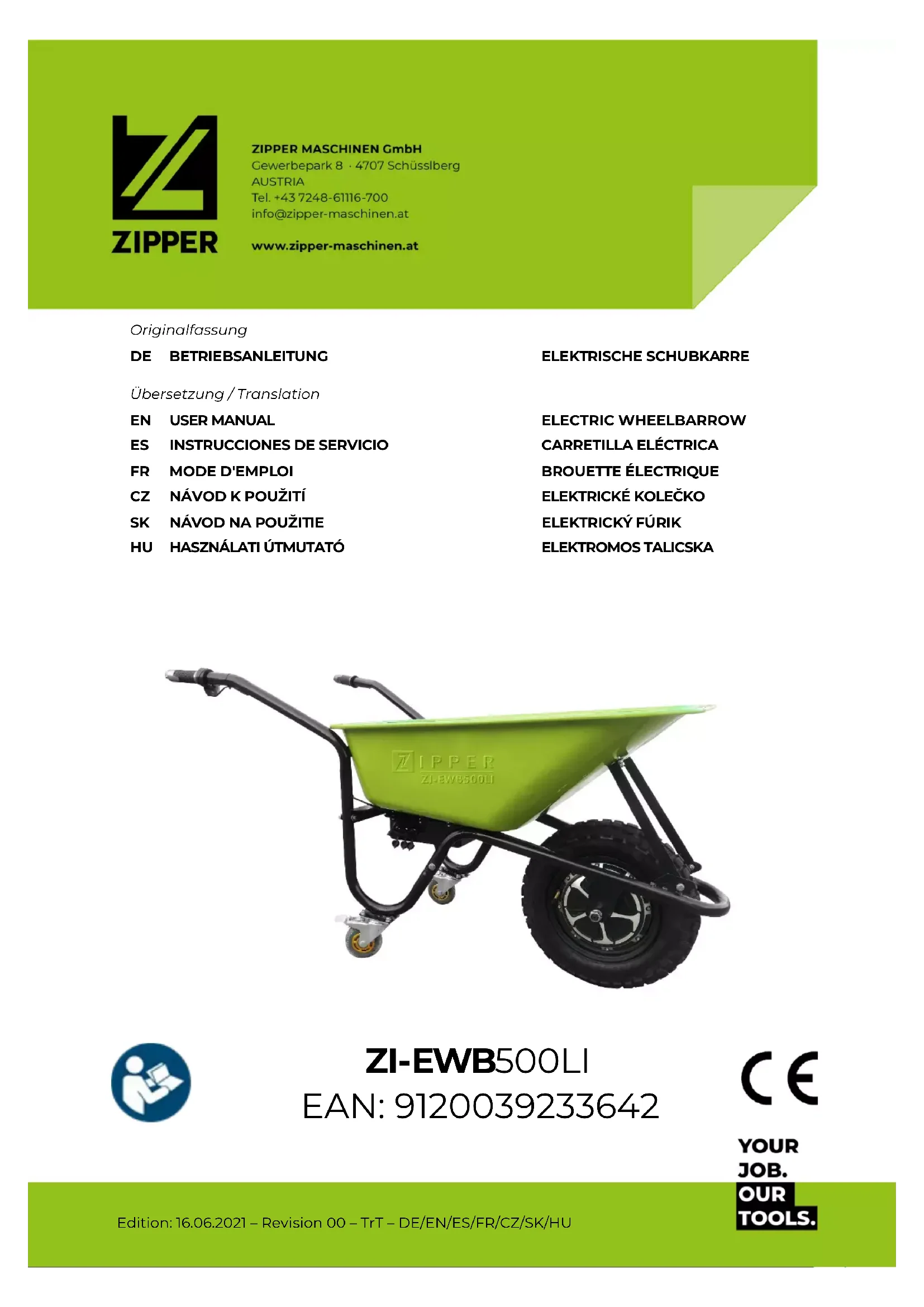 - Comprobación de las conexiones de los cables del sistema de la bateríaAVANT-PROPOS (FR) ZIPPER MASCHINEN GmbH www.Zipper-Maschinen.at 39 ZI-EWB500LI 22 AVANT-PROPOS (FR) Cher client, chère cliente ! Le présent manuel d'exploitation contient des informations et des remarques importantes relatives à la mise en service et à la manipulation sécurisée de la brouette électrique ZI-EWB500LI, ci-après désignée par « machine » dans le présent document. Le mode d'emploi fait partie intégrante de la machine et ne doit pas être retiré. Conservez- le à des fins ultérieures dans un endroit approprié et facilement accessible pour les utilisateurs (exploitants) et joignez-le à la machine si celle-ci est transmise à des tiers ! Veuillez respecter les consignes de sécurité ! Respectez les consignes de sécurité et les mises en garde contre les dangers. Toute inobservation peut occasionner de graves blessures. Nos produits peuvent légèrement diverger des illustrations et des contenus en raison du développement constant. Si vous décelez des erreurs, veuillez nous en informer. Sous réserve de modifications techniques ! Contrôler la marchandise immédiatement après réception et noter toute réclamation lors de la prise en charge de la marchandise par le livreur ! Les dommages de transport doivent nous être signalés séparément dans les 24 heures. ZIPPER MASCHINEN GmbH décline toute garantie pour les dommages liés au transport non-signalés.