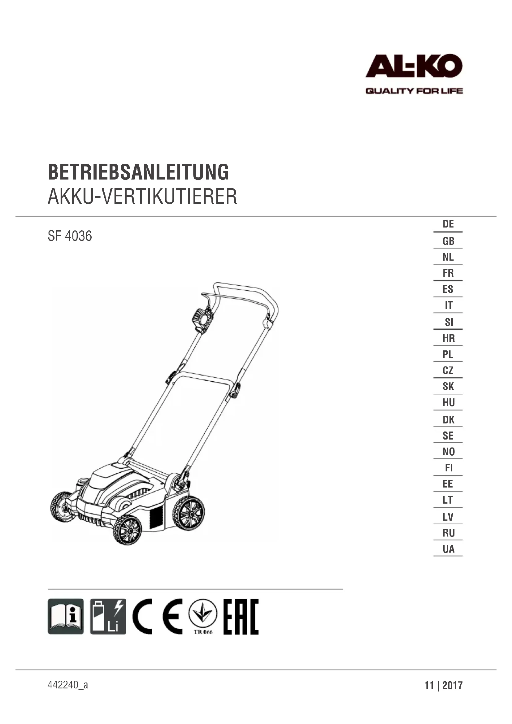 Nous déclarons par la présente que ce produit, sous la forme mise sur le marché, répond aux disposi- tions des directives CE harmonisées, des normes de sécurité de l’UE et des normes spécifiques aux produits. Produit Scarificateur sur batterie Numéro de série G1062012 Fabricant AL-KO Geräte GmbH Ichenhauser Str. 14 D-89359 Kötz Allemagne Mandataire Andreas Hedrich Ichenhauser Str. 14 D-89359 Kötz Allemagne Type SF 4036 Niveau de puissance acoustique EN ISO 3744 mesuré/garanti 90,0dB(A) / 93,0dB(A) Directives UE 2006/42/CE 2014/30/UE 2000/14/CE 2011/65/UE Déclaration de conformité 2000/14/CE Annexe V Normes harmonisées EN 60335-1:2012+A14:2014 EN 50636-2-92:2014 EN 62233:2008 EN 55014-1:2006+A2:2011 EN 55014-2:1997+A2:2008 Kötz, 22/10/2017 Wolfgang Hergeth Directeur général442240_a 99 Traducción del manual original de instrucciones TRADUCCIÓN DEL MANUAL ORIGINAL DE INSTRUCCIONES Índice 1 Acerca de este manual de instrucciones ...................................................................................... 101