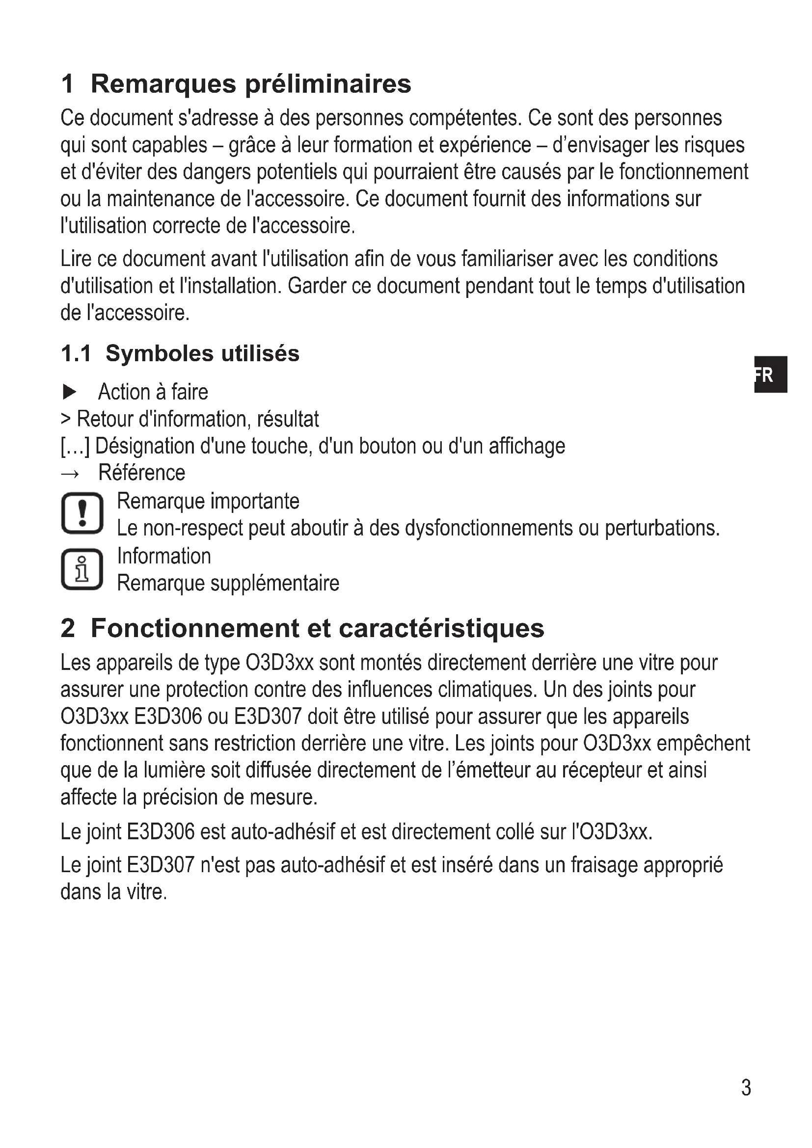 Notice de montage Joint pour O3D3xx E3D306 E3D307 80286819 / 00 07 / 2019 FR2 Contenu 1 Remarques préliminaires 3 11 Symboles utilisés 3 2 Fonctionnement et caractéristiques 3 3 Fourniture 4 31 E3D306 4 32 E3D307 4 4 Montage 4 41 Monter l'E3D306 4 42 Monter l'E3D307 63
